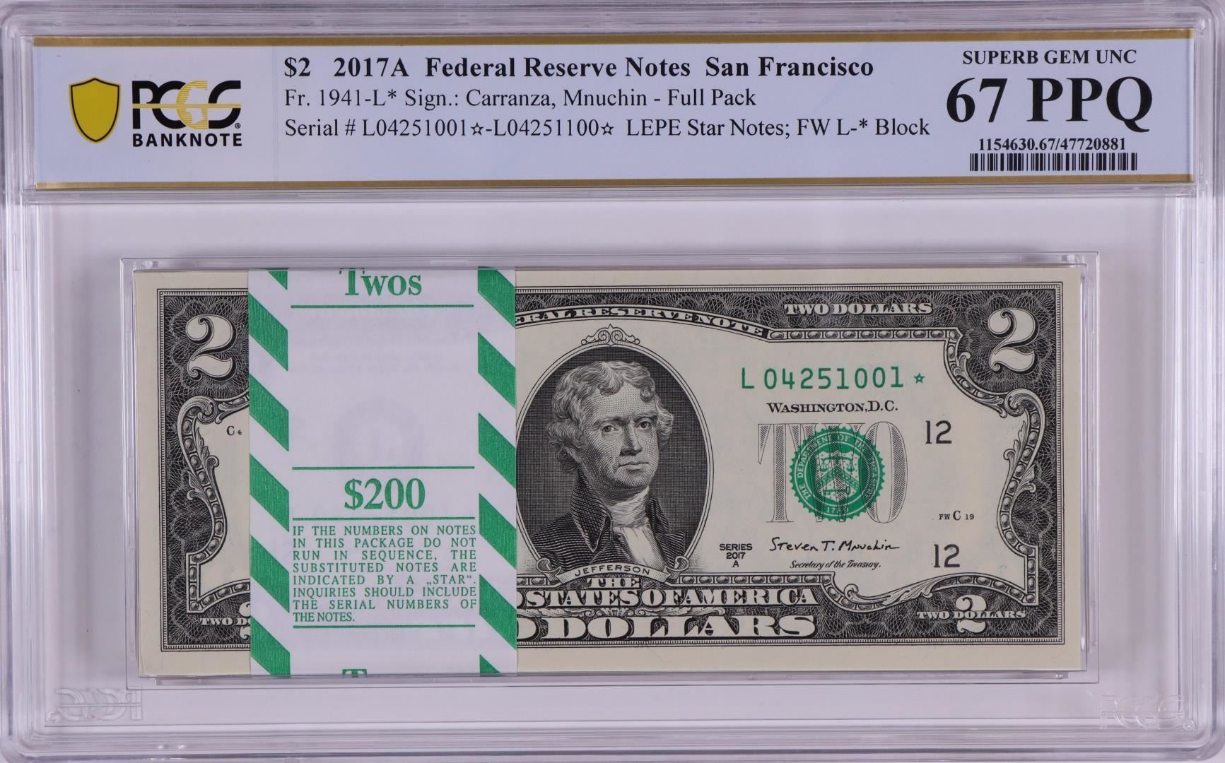 One Pack of 2017A $2 Federal Reserve STAR Notes SF Fr.1941-L* PCGS Superb Gem UNC 67PPQ. PCGS Graded.