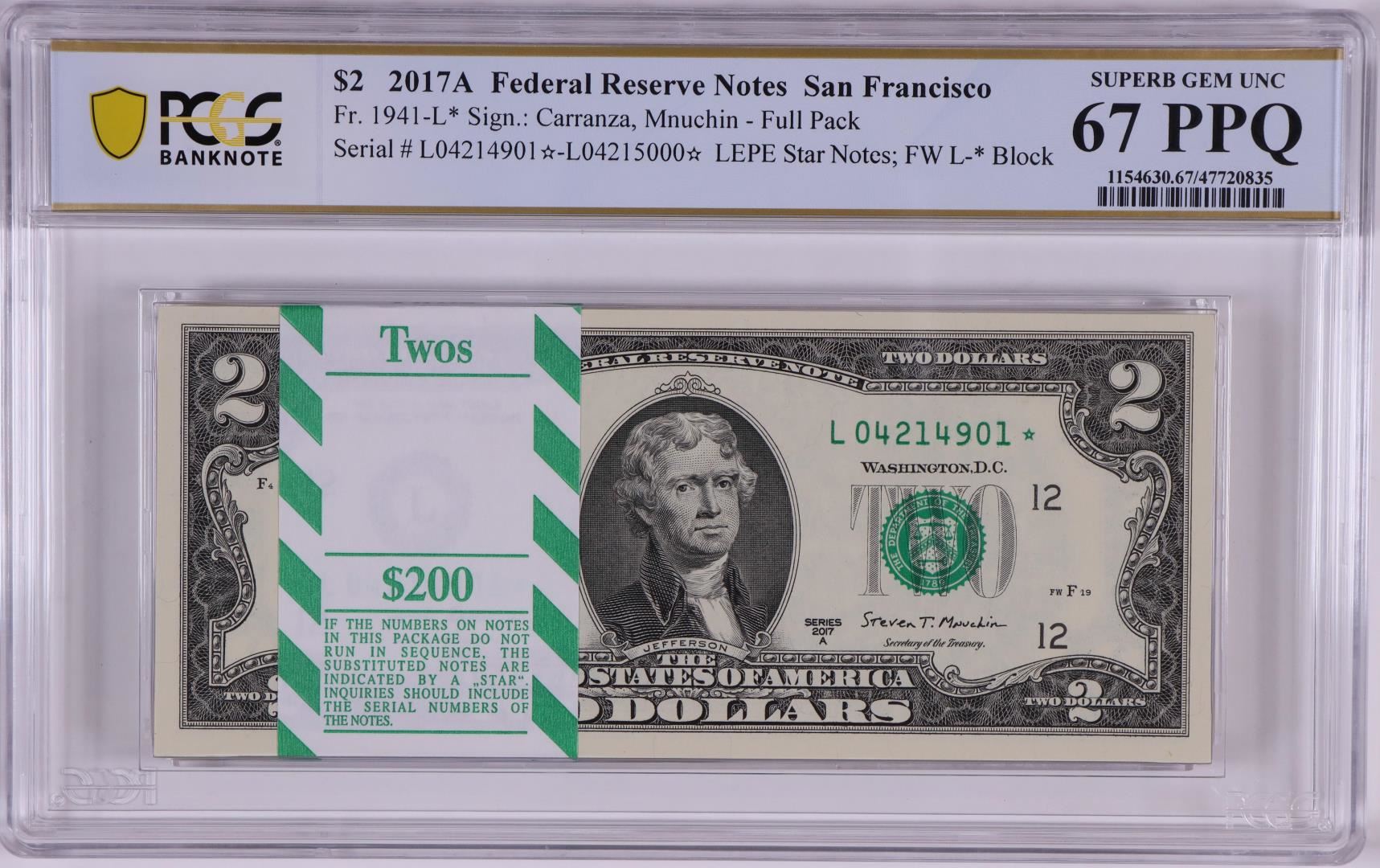 One Pack of 2017A $2 Federal Reserve STAR Notes SF Fr.1941-L* PCGS Superb Gem UNC 67PPQ. PCGS Graded.