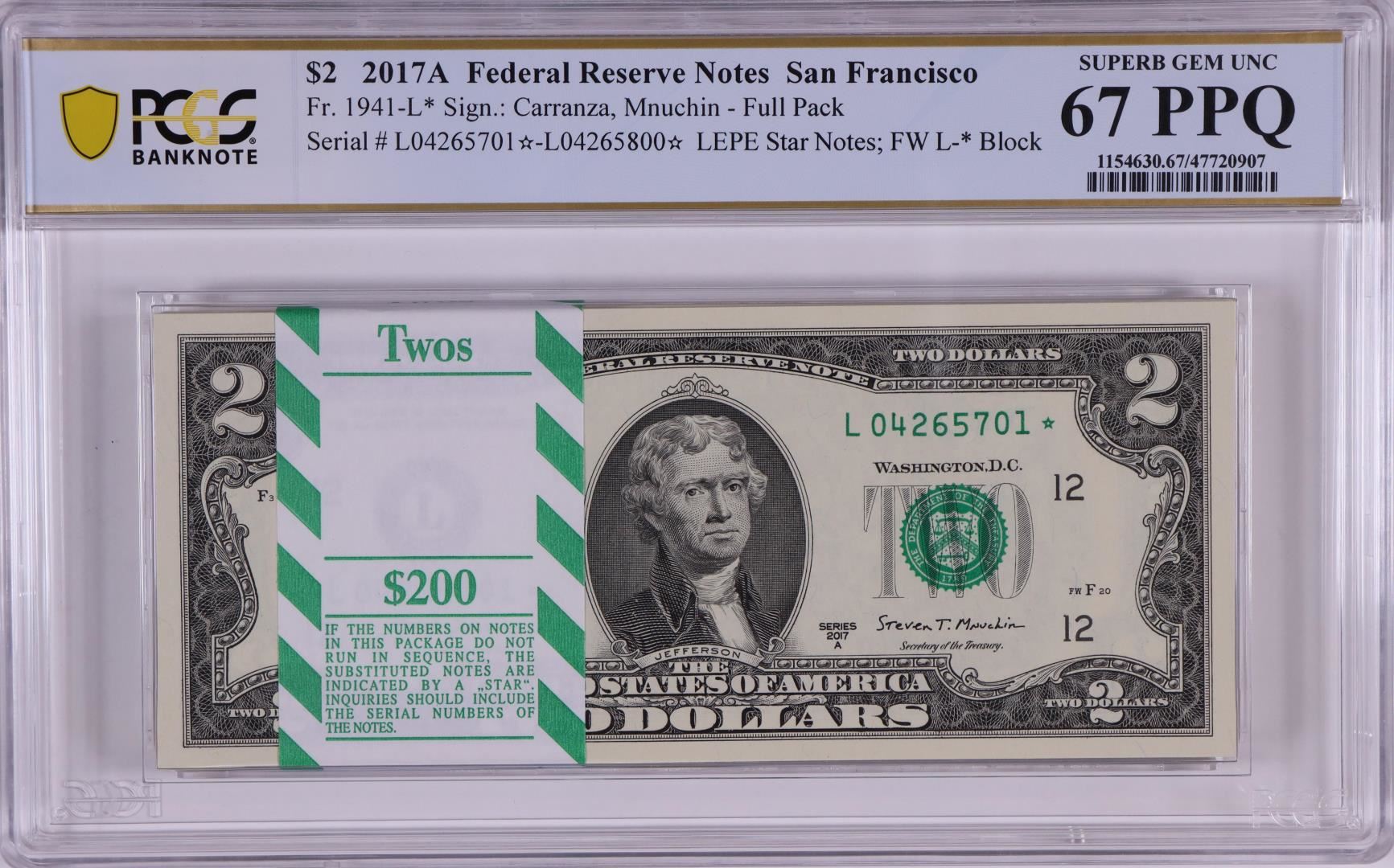 One Pack of 2017A $2 Federal Reserve STAR Notes SF Fr.1941-L* PCGS Superb Gem UNC 67PPQ. PCGS Graded.