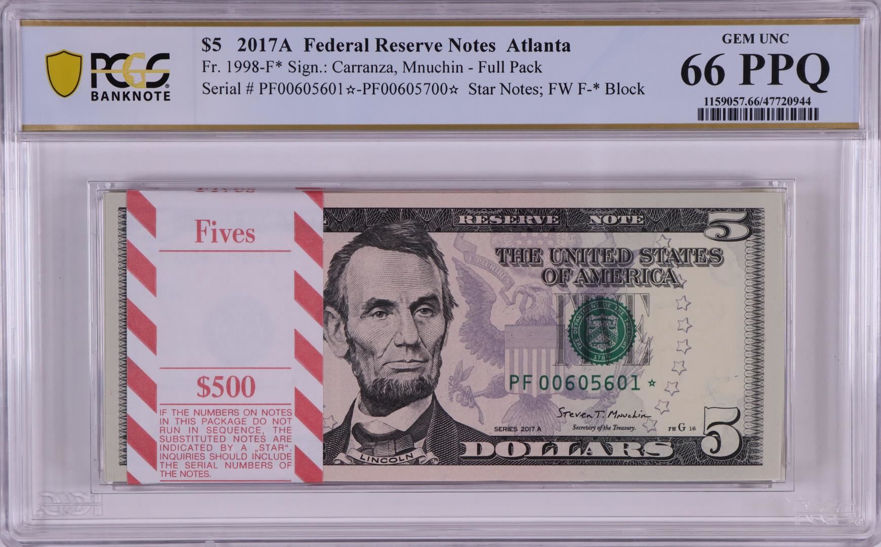 One Pack of 2017A $5 Federal Reserve STAR Notes Atlanta Fr.1998-F* PCGS Gem UNC 66PPQ. PCGS Graded.