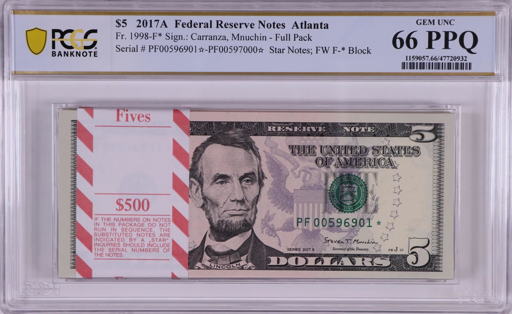 One Pack of 2017A $5 Federal Reserve STAR Notes Atlanta Fr.1998-F* PCGS Gem UNC 66PPQ. PCGS Graded.
