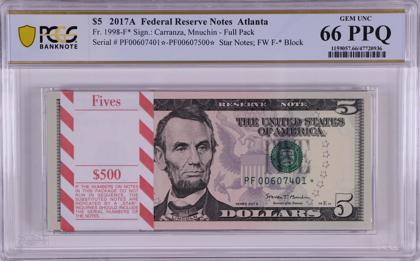 One Pack of 2017A $5 Federal Reserve STAR Notes Atlanta Fr.1998-F* PCGS Gem UNC 66PPQ. PCGS Graded.