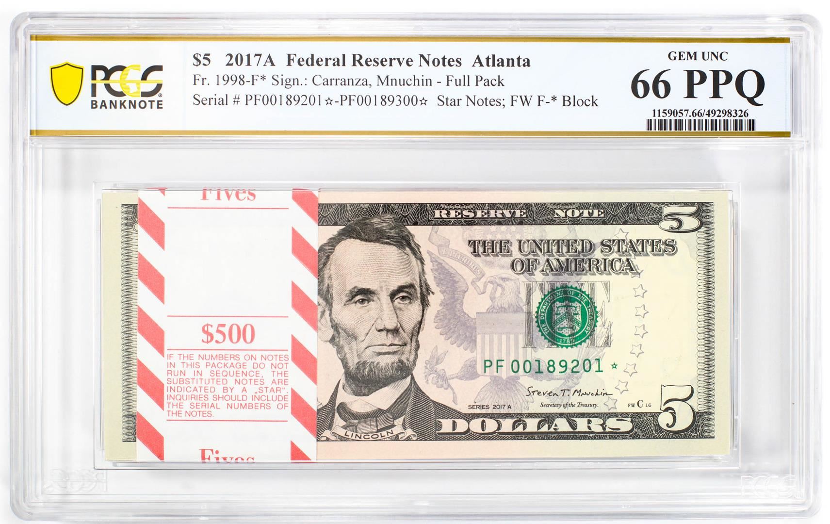 One Pack of 2017A $5 Federal Reserve STAR Notes Atlanta Fr.1998-F* PCGS Gem UNC 66PPQ. PCGS Graded.