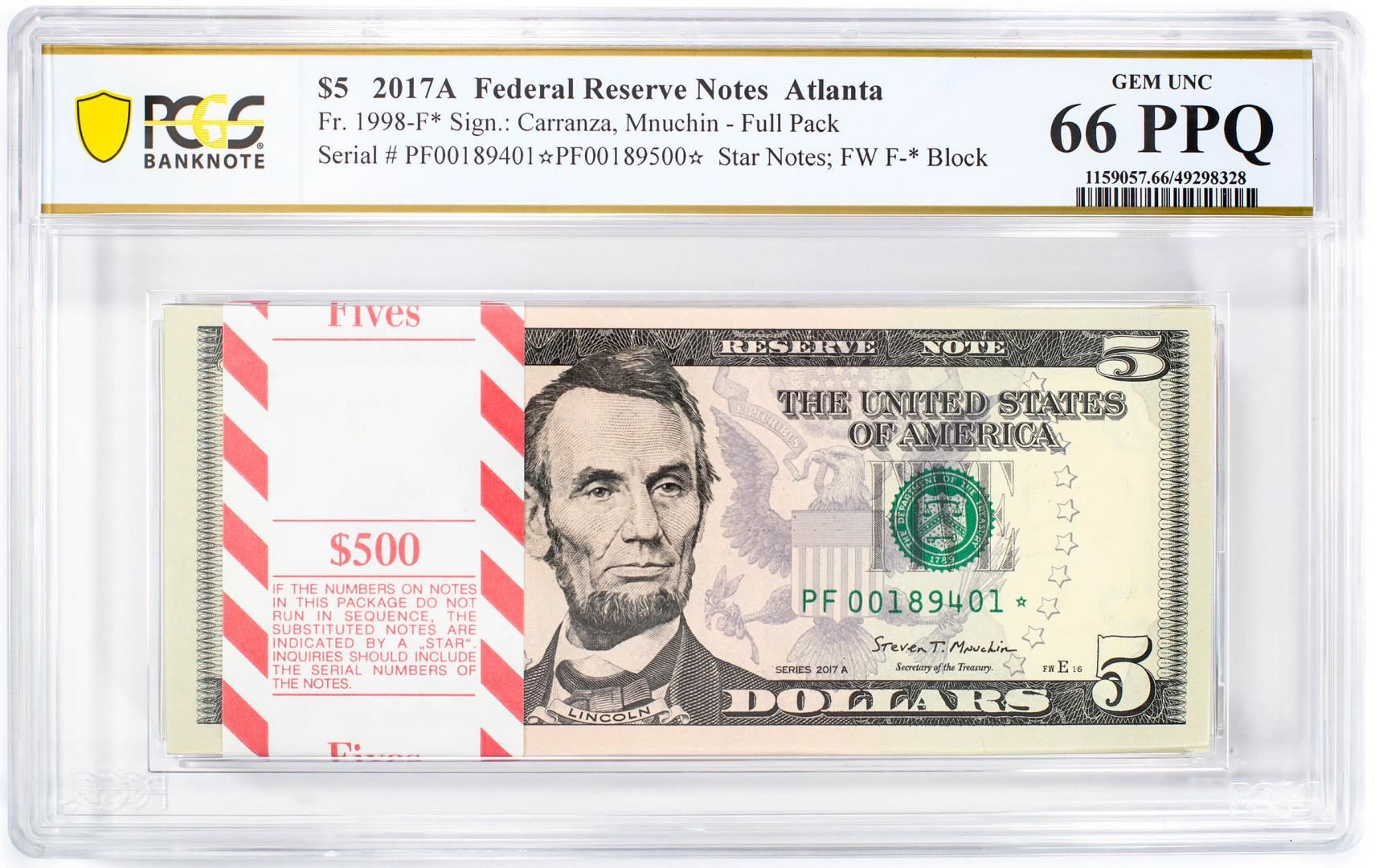 One Pack of 2017A $5 Federal Reserve STAR Notes Atlanta Fr.1998-F* PCGS Gem UNC 66PPQ. PCGS Graded.