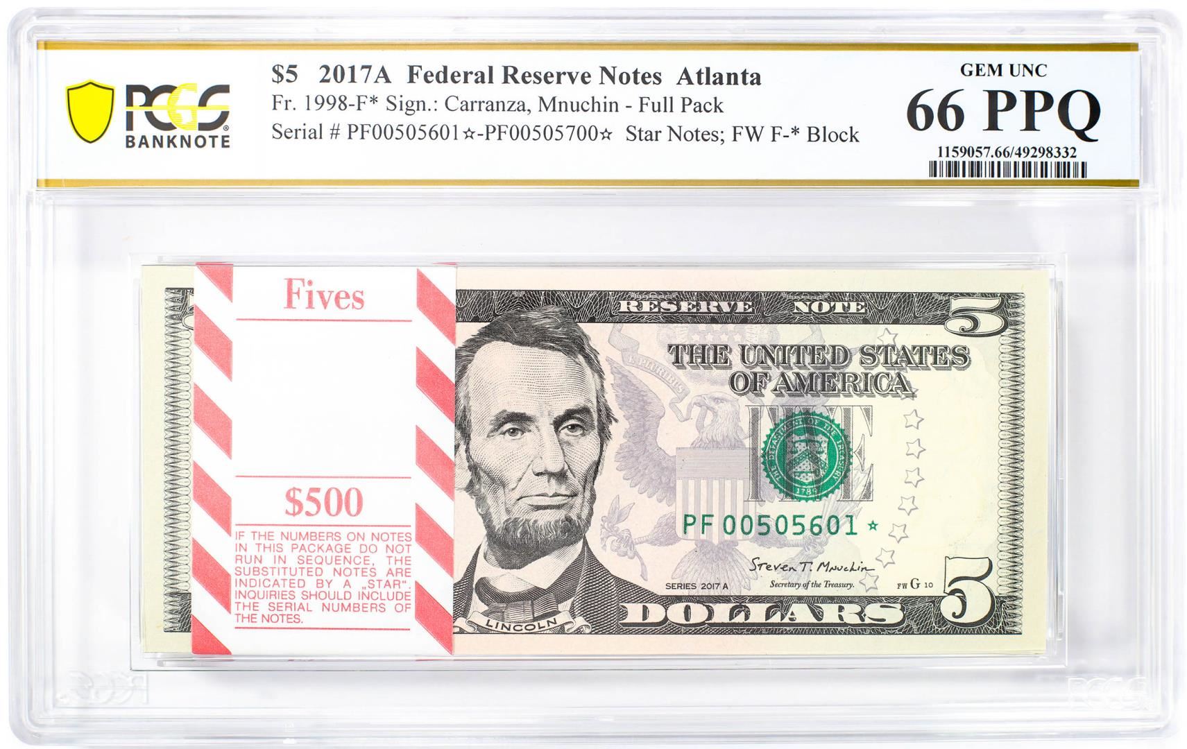 One Pack of 2017A $5 Federal Reserve STAR Notes Atlanta Fr.1998-F* PCGS Gem UNC 66PPQ. PCGS Graded.