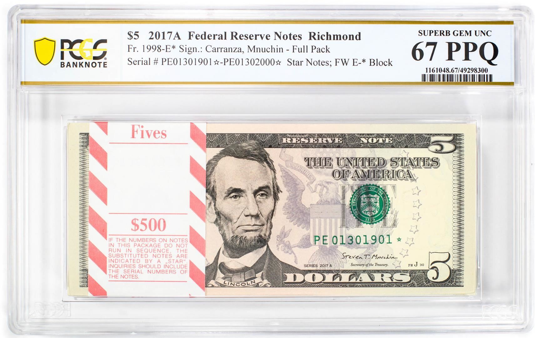 One Pack of 2017A $5 Federal Reserve STAR Notes RCH Fr.1998-E* PCGS Superb Gem UNC 67PPQ. PCGS Graded.