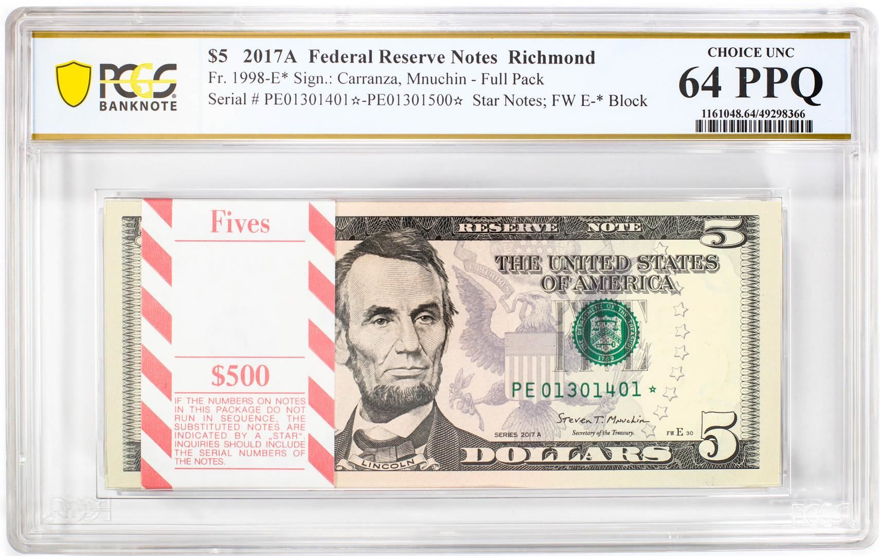 One Pack of 2017A $5 Federal Reserve STAR Notes Richmond Fr.1998-E* PCGS Choice UNC 64PPQ. PCGS Graded.
