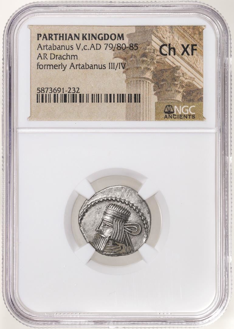 One Parthian Kingdom 79/80-85 c.AD Artabanus AR Drachm Ancient Coin NGC Ch XF. NGC Certified.