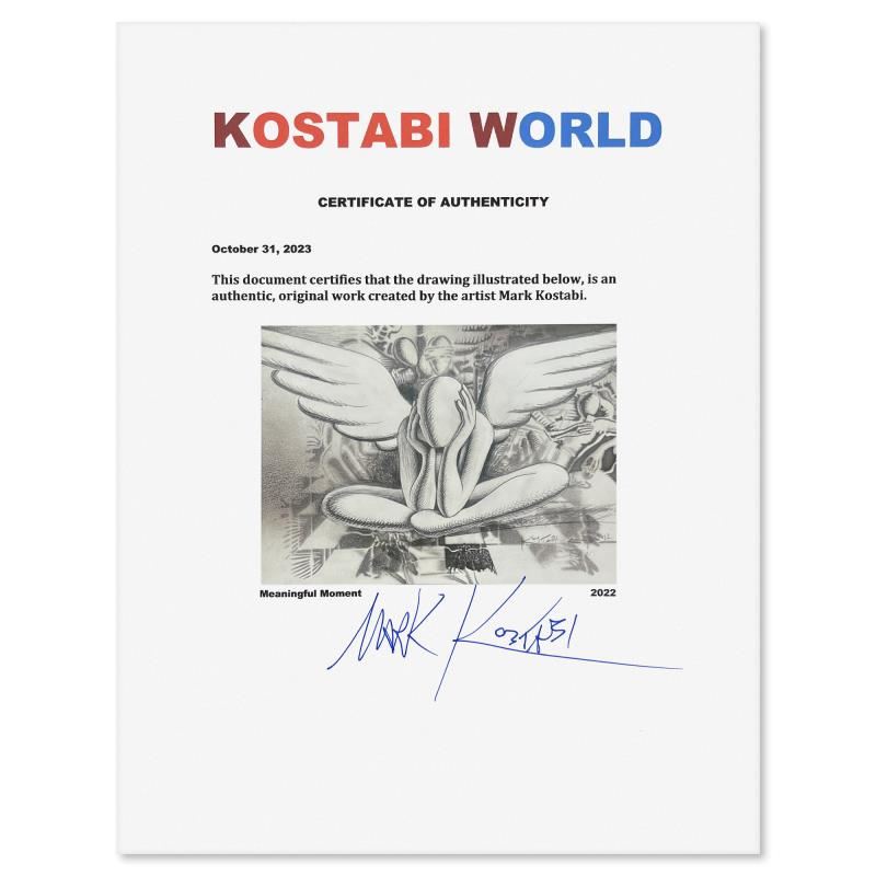 "Meaningful Moment" is an original drawing on paper by Mark Kostabi, hand signed by the artist. This piece comes custom framed and includes a certificate of authenticity. Measures approximately 15.5" x 19" (frame), 9.5" x 13" (image).
