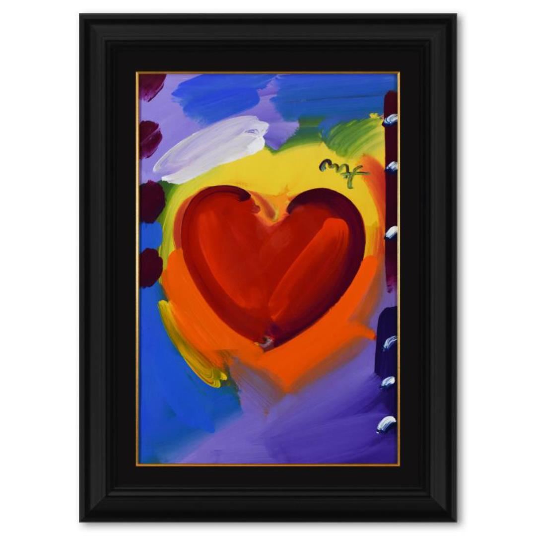 "Heart" is a one-of-a-kind acrylic mixed media on paper, hand signed by Peter Max. This piece comes custom framed. Includes Letter of Authenticity from Peter Max Studios and bears registration number inverso (232450). Measures approx. 34.5" x 47" (frame), 23" x 35" (image).