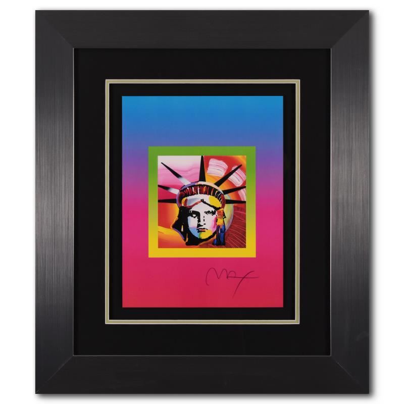 "Liberty Head on Blends Ver II" is a limited edition lithograph on paper by Peter Max, numbered 445/500 and hand signed by the artist. This piece comes framed. Includes Certificate of Authenticity from Peter Max Studios. Measures approximately 27" x 31" (frame), 13" x 17" (image).