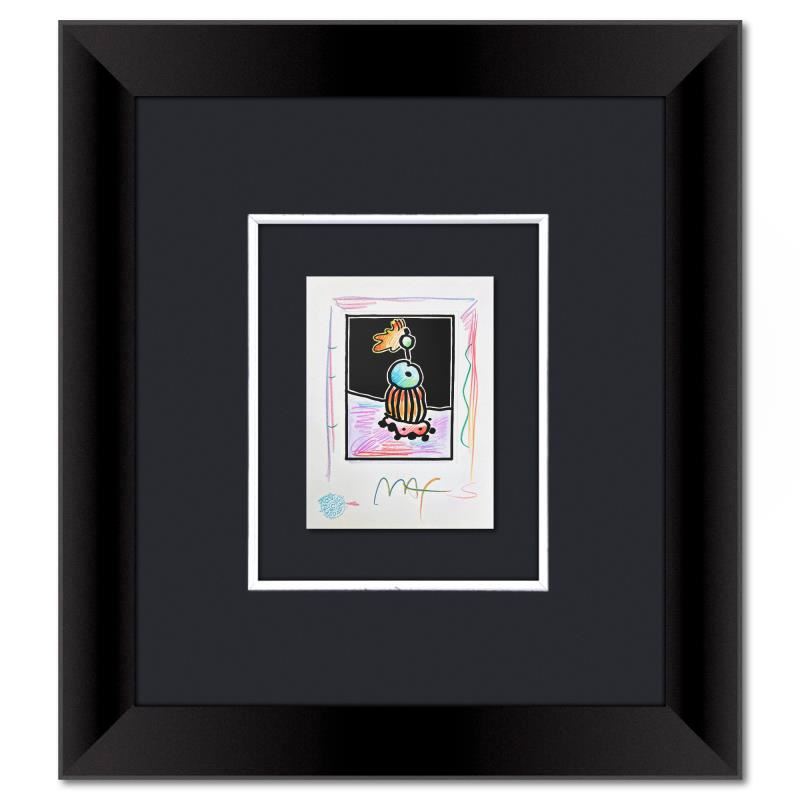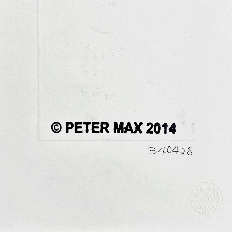 This is a one-of-a-kind mixed media on paper, hand signed by Peter Max. The piece comes custom framed with a backside cutout to display Peter Max Studio registration number 340428 certifying authenticity. Measures approximately 22.5" x 20" (frame), 8.5" x 6" (image).