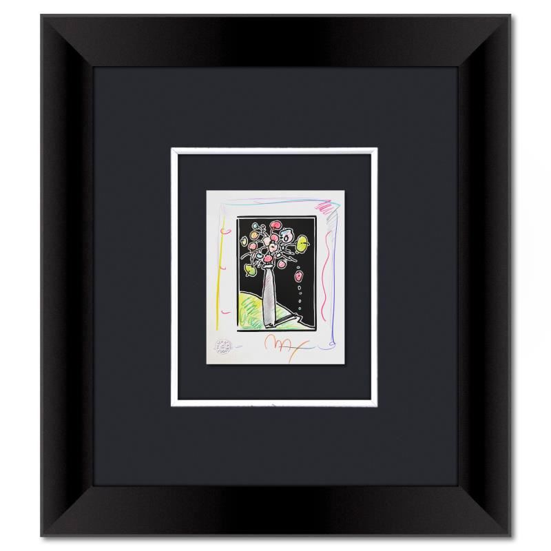 This is a one-of-a-kind mixed media on paper, hand signed by Peter Max. The piece comes custom framed with a backside cutout to display Peter Max Studio registration number 340340 certifying authenticity. Measures approximately 23" x 21" (frame), 9" x 7" (image).
