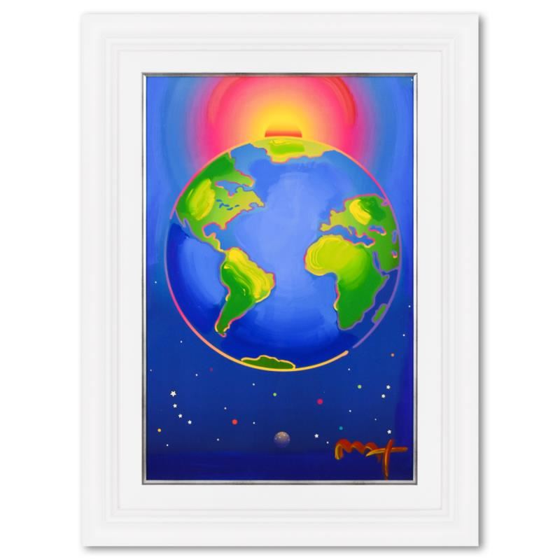 "State of the World Forum" is a one-of-a-kind acrylic mixed media on paper, hand signed by Peter Max. This piece comes custom framed. On the reverse side of this piece there is a registration number (317206) from Peter Max Studios certifying authenticity. Measures approx. 46.5" x 34.5" (with frame), 35" x 23" (image).