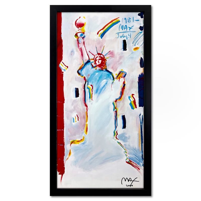 "Statue of Liberty II" is an offset lithograph on paper by Peter Max, hand signed by the artist. This piece comes custom framed. Includes Letter of Authenticity. Measures approx. 36.5" x 20" (frame), 32.5" x 16" (image).