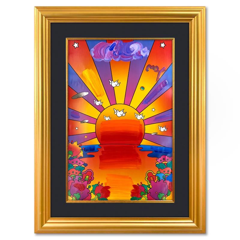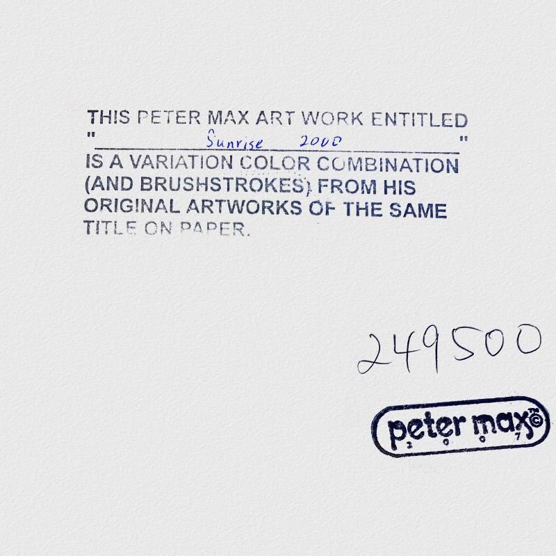 "Sunrise 2000" is a one-of-a-kind mixed media on paper, hand signed by Peter Max. The piece comes custom framed with a backside cutout to display Peter Max Studio registration number 249500 certifying authenticity. Measures approximately 48" x 36" (frame), 36" x 24" (image).