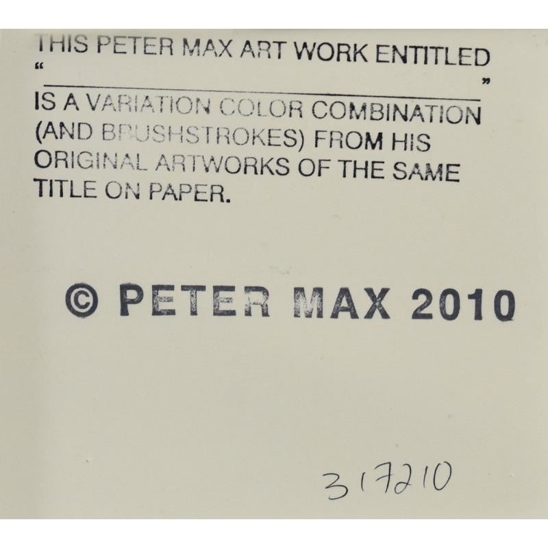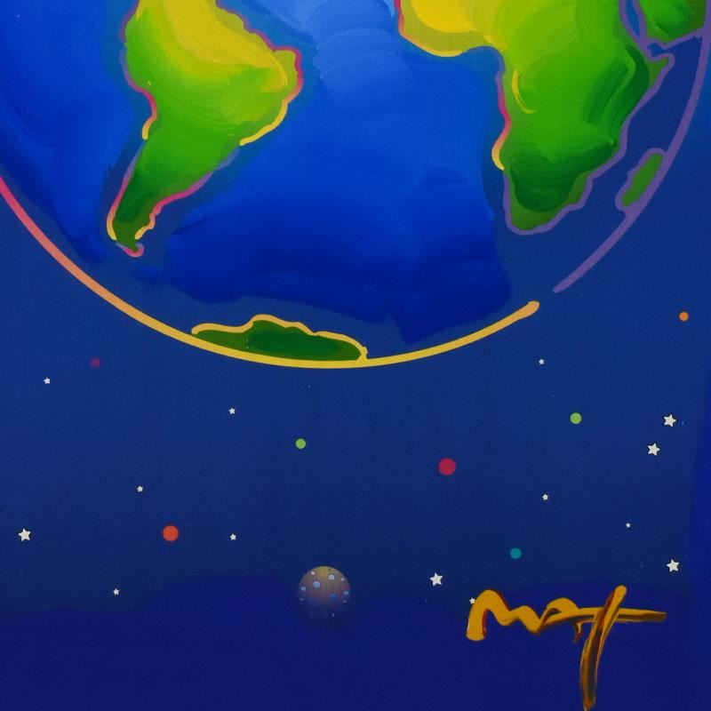 "The State of the World" is a one-of-a-kind acrylic mixed media on paper, hand signed by Peter Max. This piece comes custom framed. Includes Letter of Authenticity from Peter Max Studios and bears registration number inverso (317210). Measures approx. 33" x 45" (with frame), 23" x 35" (image).