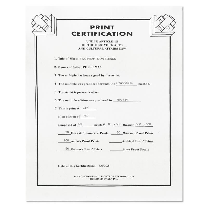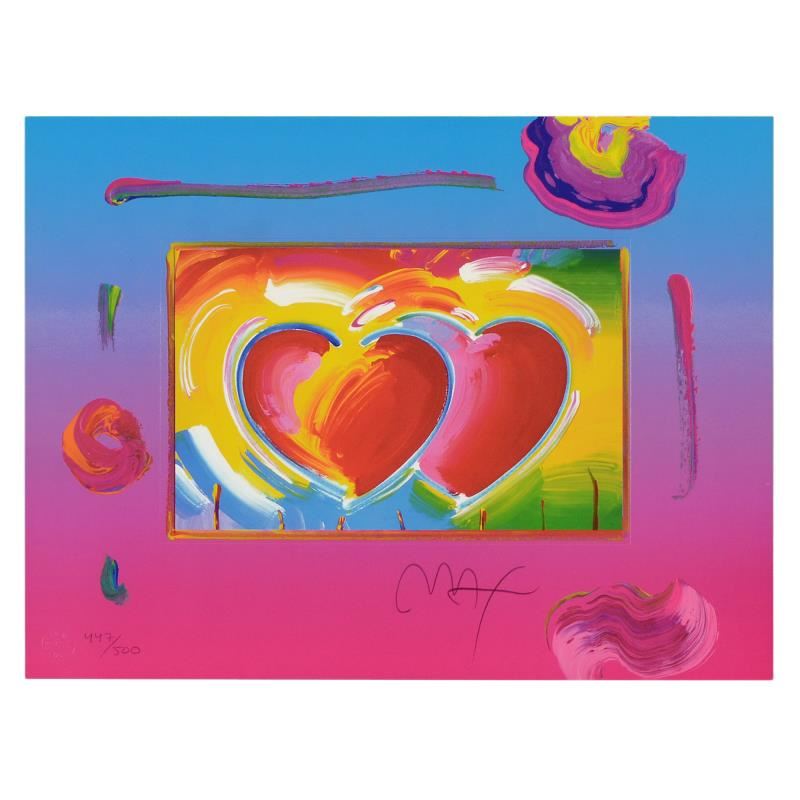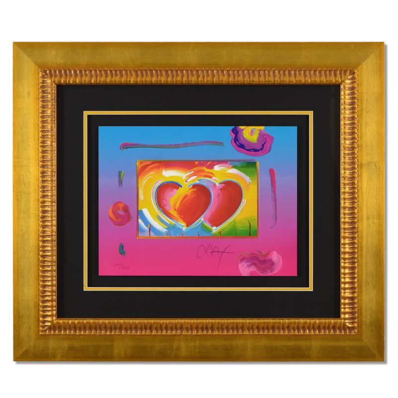 "Two Hearts on Blends" is a limited edition lithograph on paper by Peter Max, numbered 447/500 and hand signed by the artist. This piece comes framed. Includes Certificate of Authenticity from Peter Max Studios. Measures approximately 32" x 28" (frame), 17" x 13" (image). Please note: This piece was newly custom framed, but has a couple very minor nicks from transportation.