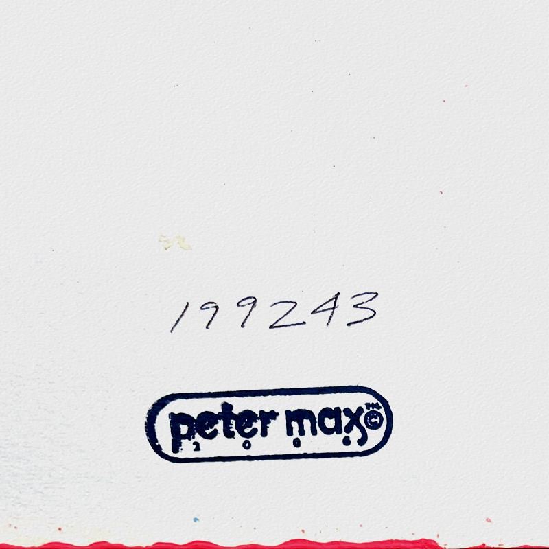 "United We Stand" is a one-of-a-kind mixed media on paper, hand signed by Peter Max. The piece comes custom framed with a backside cutout to display Peter Max Studio registration number 199243 certifying authenticity. Measures approximately 35" x 29" (frame), 24" x 18" (image).