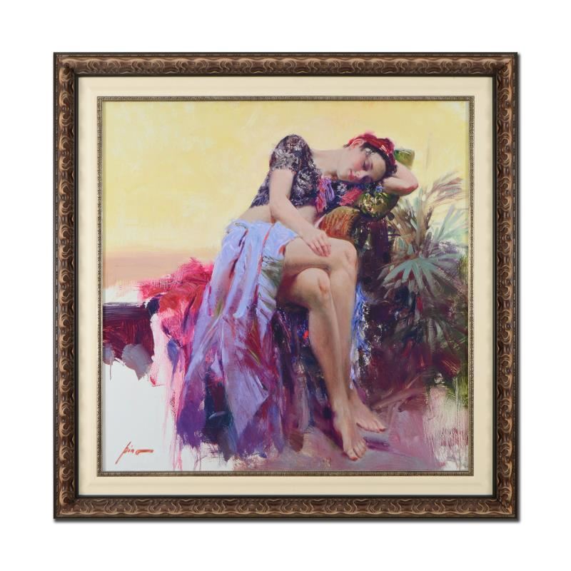 Pino's portraits allow glimpses into intensely personal, intimate spaces, conveying emotion through rich, warm color and sensual brushwork. "Siesta" is an artist-embellished limited edition giclee on canvas by Pino (1939-2010). The piece is numbered, hand signed, custom framed, and includes certificate of authenticity. Measures approx. 43.5" x 43.5" (frame), 34" x 34" (image).