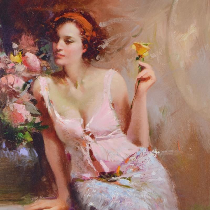 Pino's portraits allow glimpses into intensely personal, intimate spaces, conveying emotion through rich, warm color and sensual brushwork. "Sweet Scent" is an artist-embellished limited edition giclee on canvas by Pino (1939-2010). The piece is numbered, hand signed, custom framed, and includes certificate of authenticity. Measures approx. 27.5" x 33.5" (frame), 20" x 26" (image).