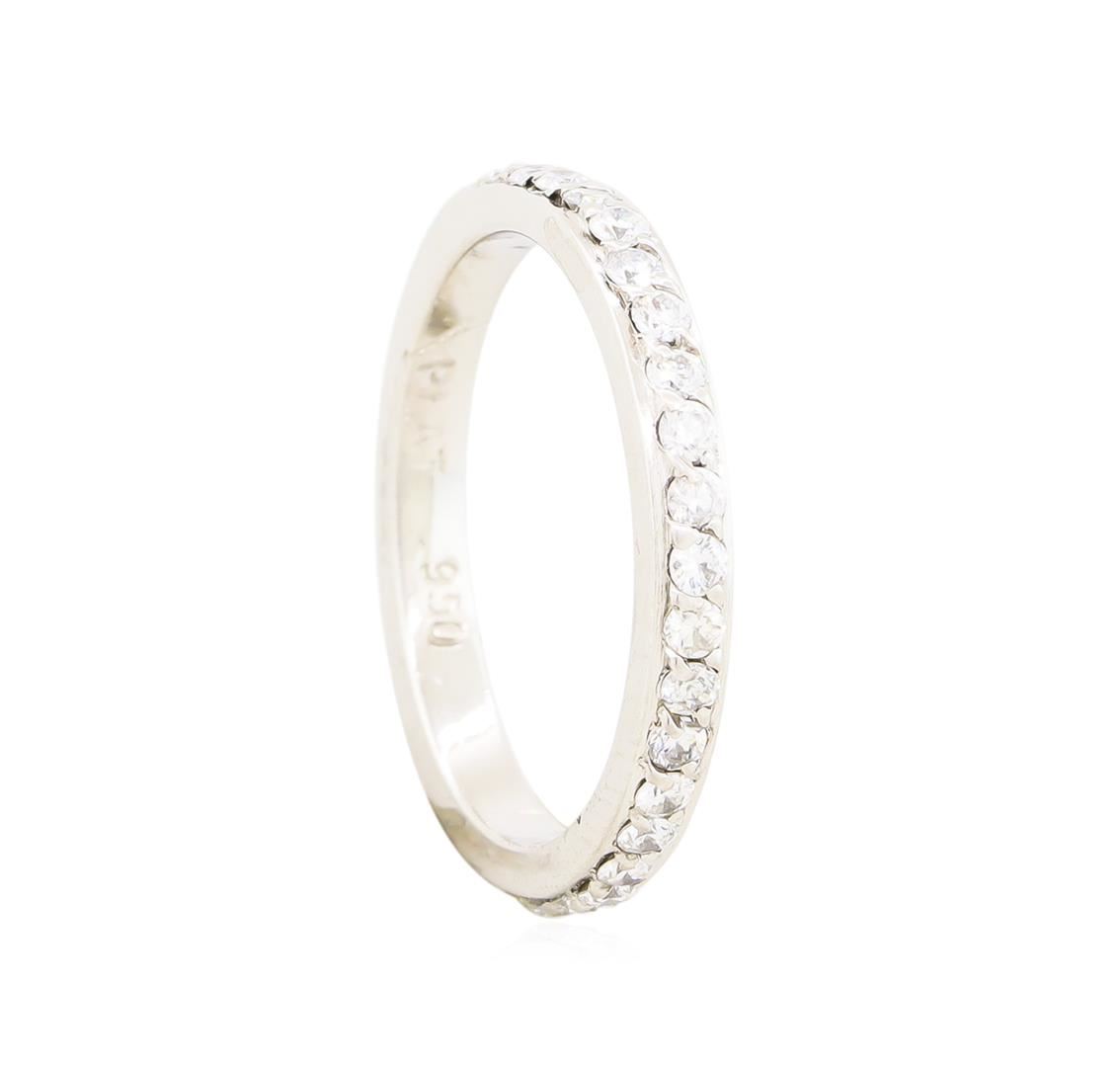 One electronically tested platinum lady's cast straight line wedding band with a bright polish finish. The featured lady's ring has a shank measuring 2.25 millimeters wide. Identified with markings of "950 PLAT". Condition is new, good workmanship. Containing: Twenty-Five prong set round brilliant cut diamonds, measuring 1.60 - 1.55 x 0.98mm (depth est.) approximate. Total Weight of 25 Stones = 0.37ct. Graded in the setting. Clarity: VS-2 to SI-1. Color: F - G, Cut Good. Total Weight of Diamonds 0.37ct. Total Weight of Band 3.70gm. GAS Appraised at $2,035.00.