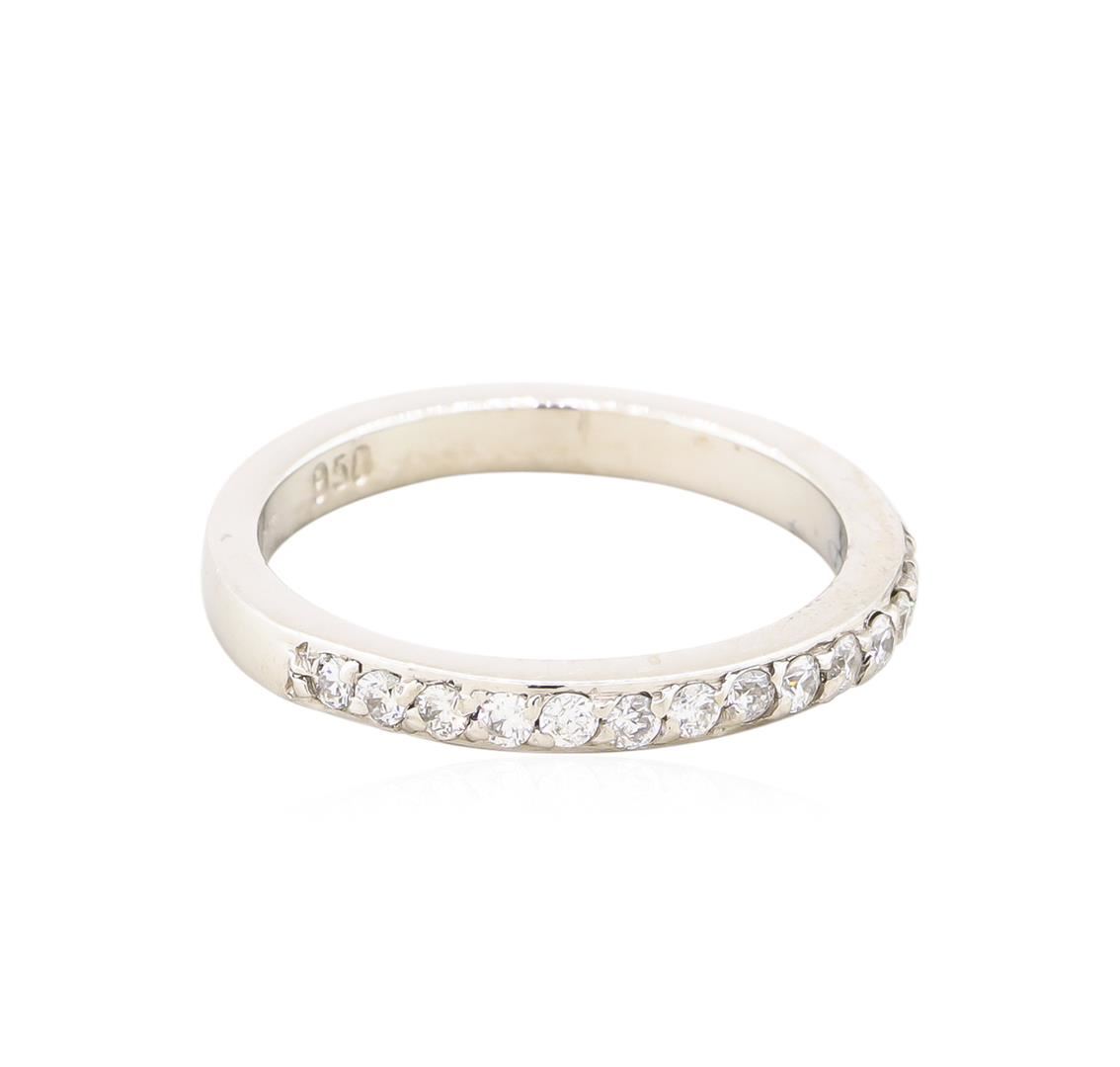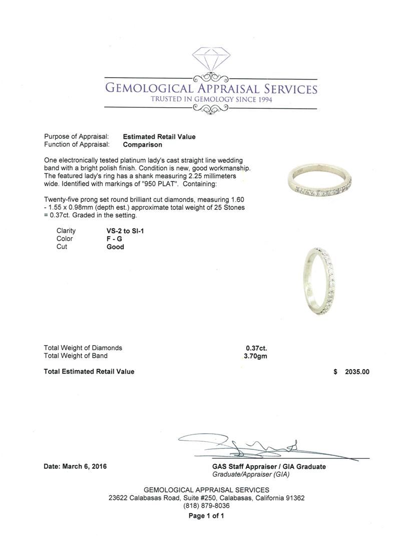One electronically tested platinum lady's cast straight line wedding band with a bright polish finish. The featured lady's ring has a shank measuring 2.25 millimeters wide. Identified with markings of "950 PLAT". Condition is new, good workmanship. Containing: Twenty-Five prong set round brilliant cut diamonds, measuring 1.60 - 1.55 x 0.98mm (depth est.) approximate. Total Weight of 25 Stones = 0.37ct. Graded in the setting. Clarity: VS-2 to SI-1. Color: F - G, Cut Good. Total Weight of Diamonds 0.37ct. Total Weight of Band 3.70gm. GAS Appraised at $2,035.00.