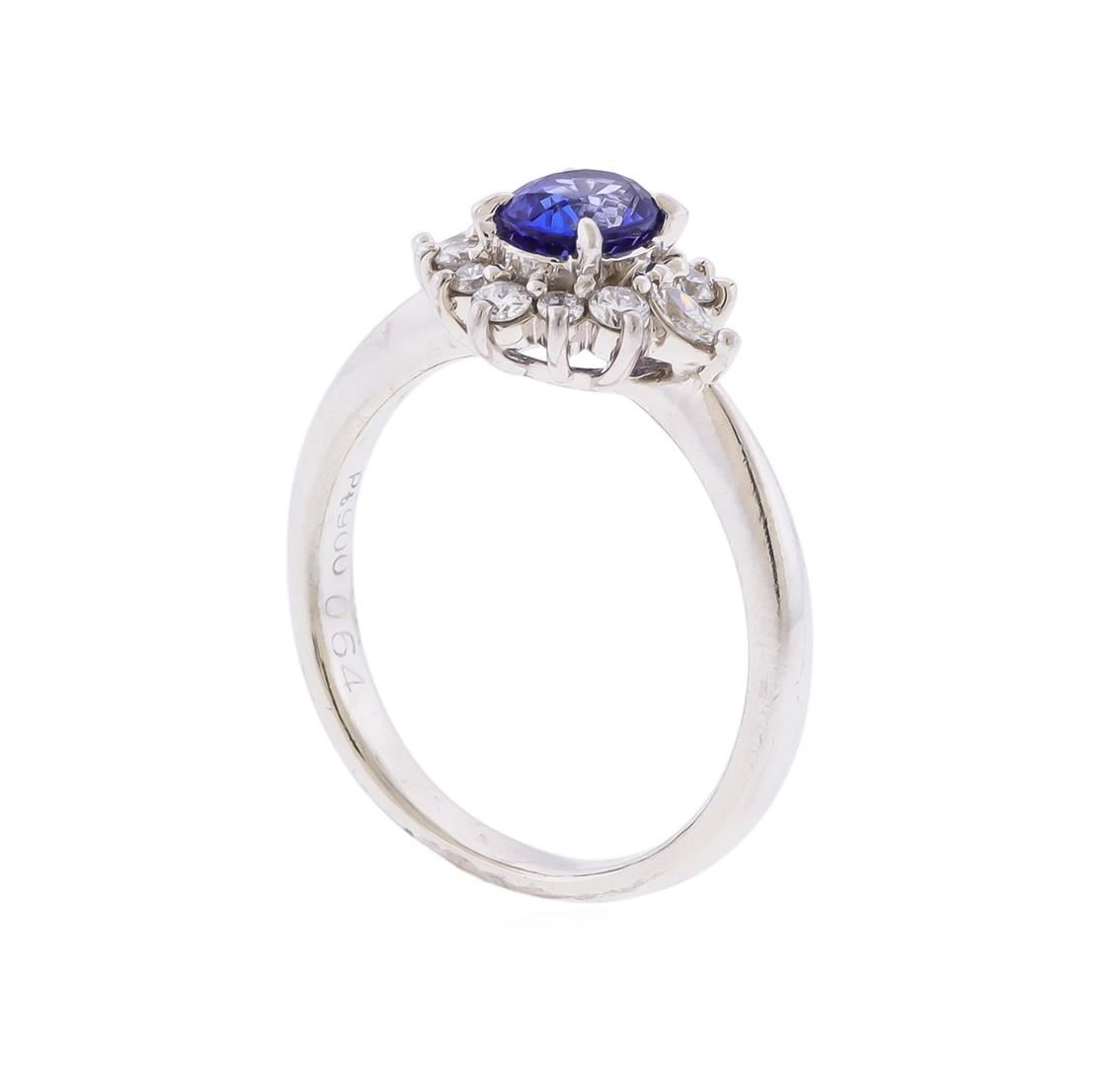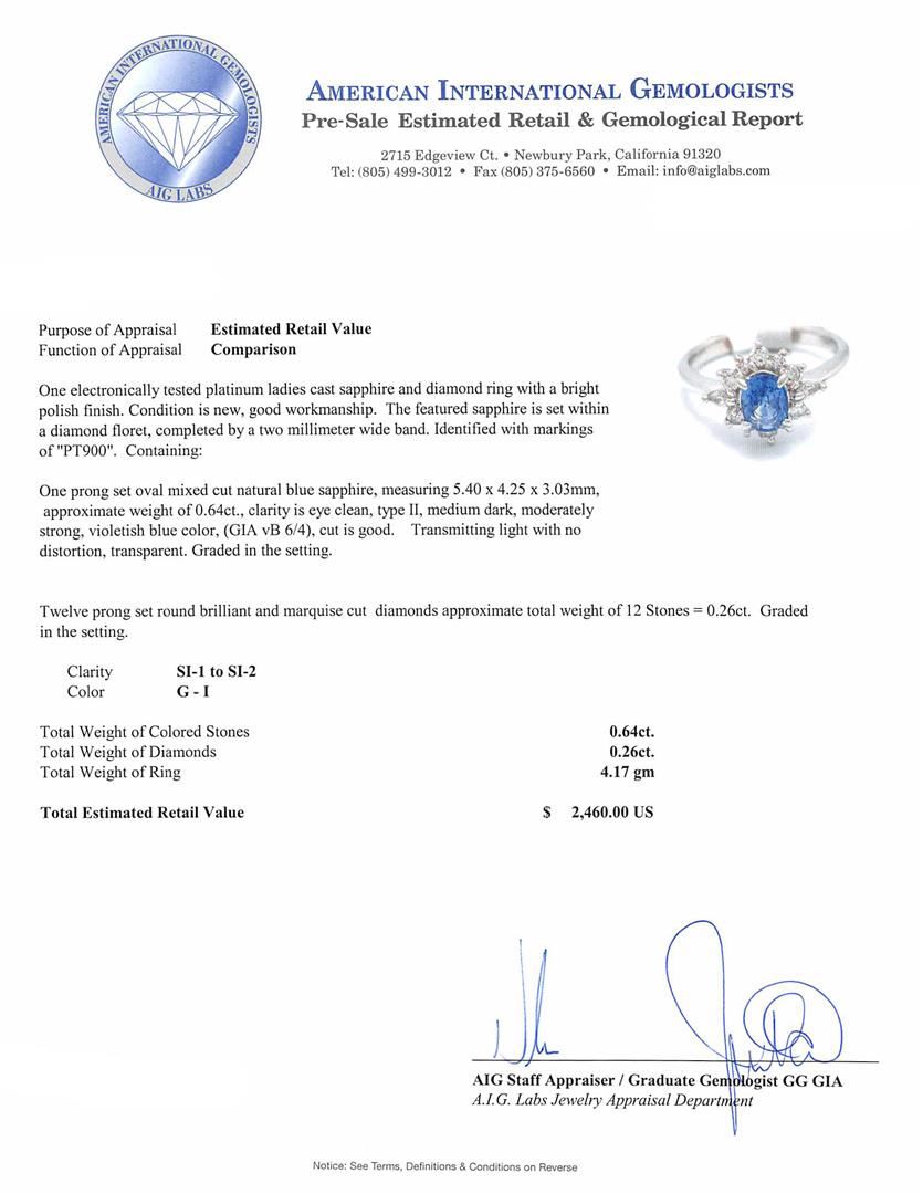 One electronically tested platinum ladies cast sapphire and diamond ring with a bright polish finish. The featured sapphire is set within a diamond floret, completed by a two millimeter wide band. Identified with markings of "PT900". Condition is new, good workmanship. Containing: One prong set oval mixed cut natural blue sapphire, measuring 5.40 x 4.25 x 3.03mm, approximate weight of 0.64ct., clarity is eye clean, type II, medium dark, moderately strong, violetish blue color, (GIA vB 6/4), cut is good. Transmitting light with no distortion, transparent. Graded in the setting.Twelve prong set round brilliant and marquise cut diamonds approximate total weight of 12 Stones = 0.26ct. Graded in the setting. Clarity: SI-1 to SI-2. Color: G - I. Total Weight of Colored Stones 0.64ct. Total Weight of Diamonds 0.26ct. Total Weight of Ring 4.17gm. AIG Appraised at $2,460.00.