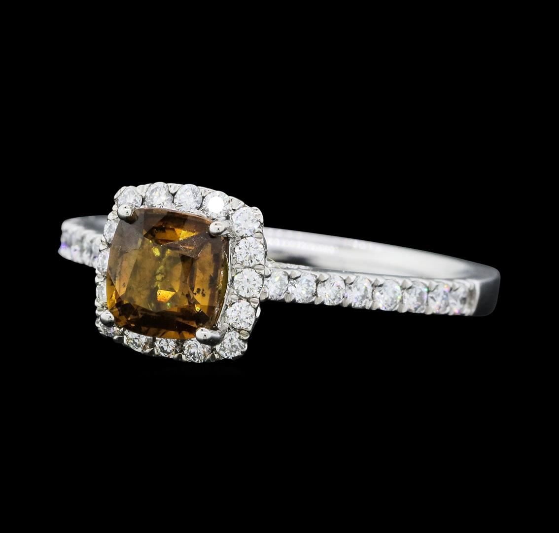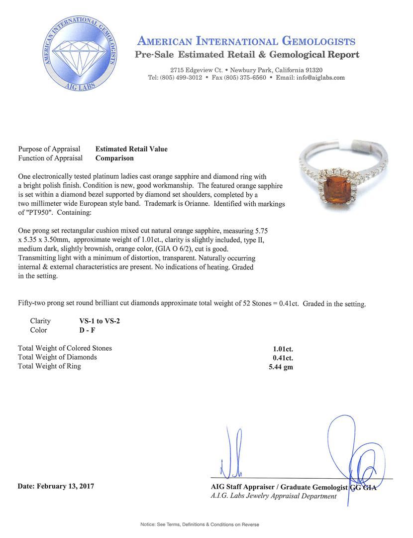 One electronically tested platinum ladies cast orange sapphire and diamond ring with a bright polish finish. The featured orange sapphire is set within a diamond bezel supported by diamond set shoulders, completed by a two millimeter wide European style band. Trademark is Orianne. Identified with markings of "PT950". Condition is new, good workmanship. Containing: One prong set rectangular cushion mixed cut natural orange sapphire, measuring 5.75 x 5.35 x 3.50mm, approximate weight of 1.01ct., clarity is slightly included, type II, medium dark, slightly brownish, orange color, (GIA O 6/2), cut is good. Transmitting light with a minimum of distortion, transparent. Naturally occurring internal & external characteristics are present. No indications of heating. Graded in the setting. Fifty-Two prong set round brilliant cut diamonds approximate total weight of 52 Stones = 0.41ct. Graded in the setting. Clarity: VS-1 to VS-2. Color: D - F. Total Weight of Colored Stones 1.01ct. Total Weight of Diamonds 0.41ct. Total Weight of Ring 5.44gm. AIG Appraised.