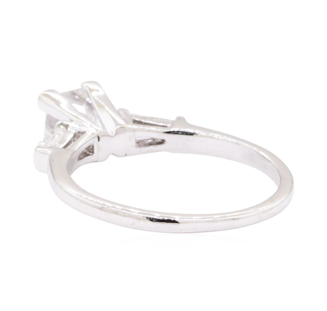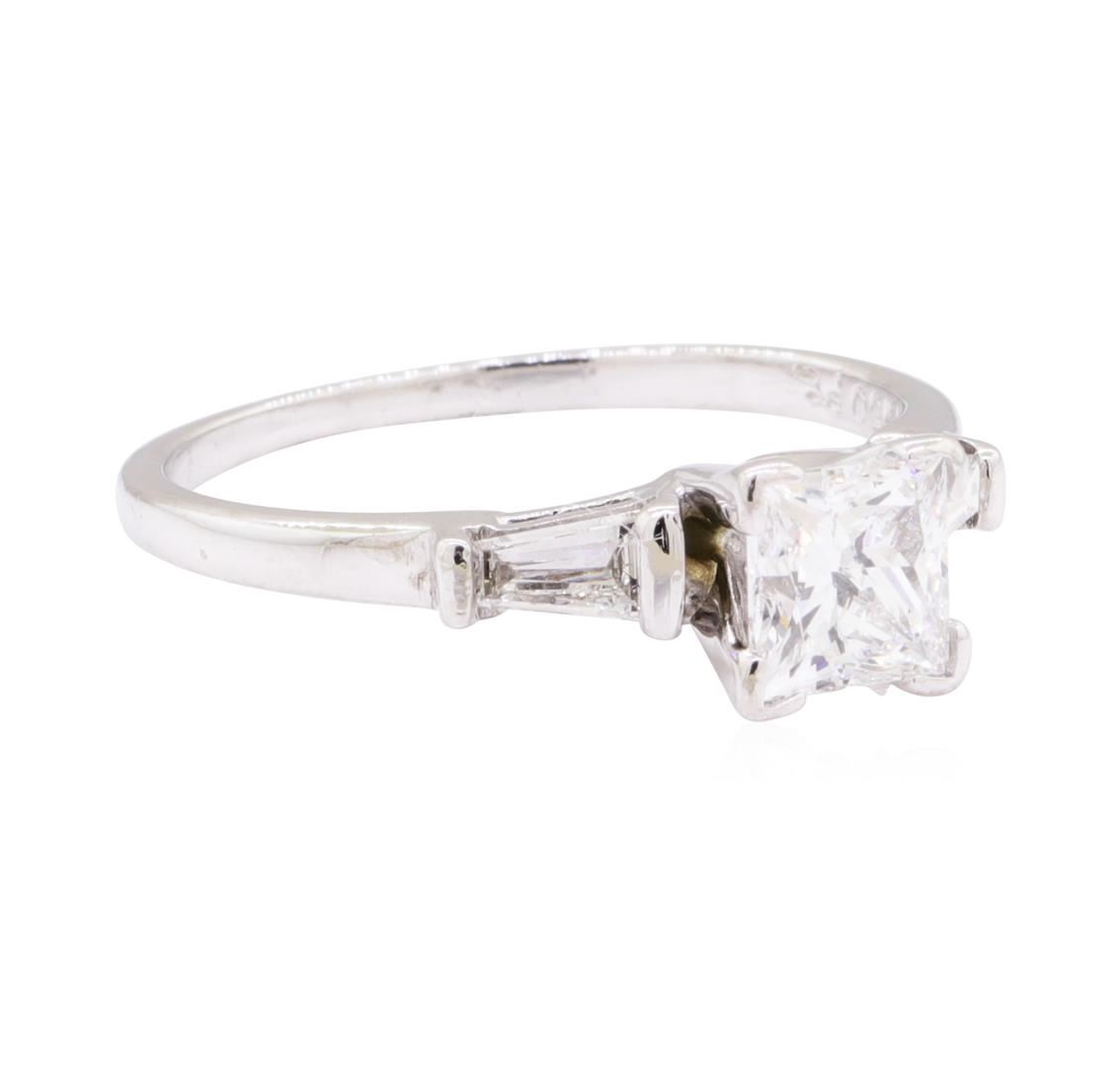 One electronically tested platinum lady's combination cast & assembled engagement ring with a bright polish finish. The featured lady's ring has a shank measuring 1.30 millimeters wide. Identified with markings of 'PLAT 950'. Condition is like new, good workmanship. Containing: One prong set princess cut diamond, measuring 5.17 x 5.00 x 3.75mm (depth est.) approximate weight of 0.80ct. Graded in the setting. Color H, Clarity SI-1, Cut Very Good Two channel set baguette cut (tapered) diamonds, measuring from 3.95 x 2.00 x 1.70mm (depth est.) to 4.00 x 2.00 x 1.70mm (depth est.) approximate total weight of 2 Stones = 0.25ct. Graded in the setting. Color H - I, Clarity VS-1 to VS-2, Cut Very Good. Total Weight of Diamonds 1.05ct. Total Weight of Ring 3.80gm. GAS Appraised.