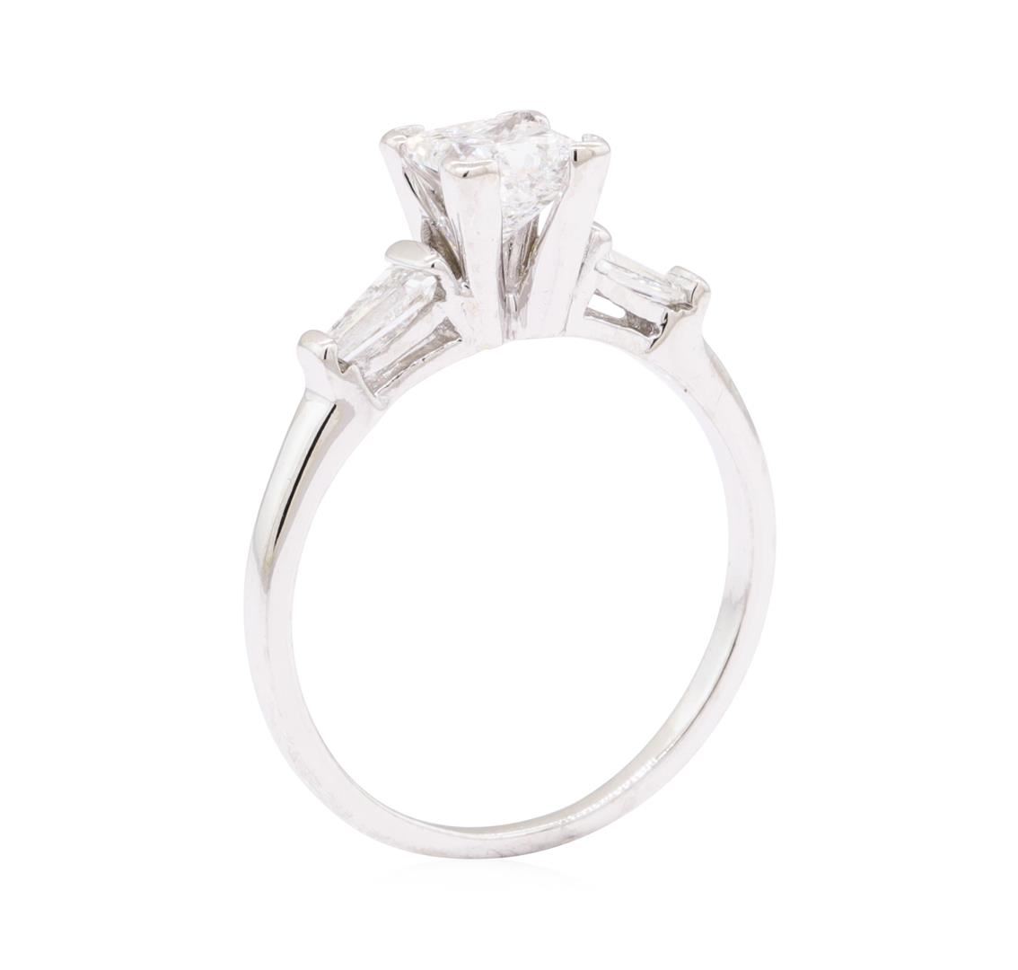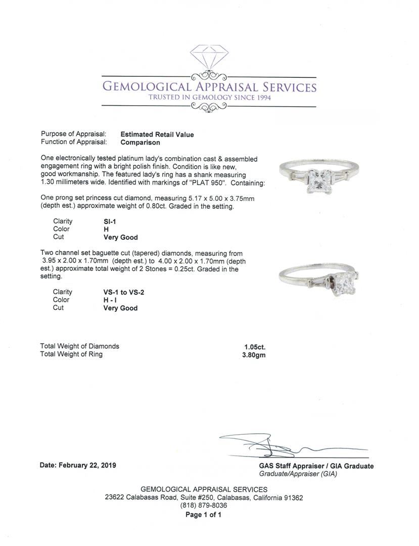One electronically tested platinum lady's combination cast & assembled engagement ring with a bright polish finish. The featured lady's ring has a shank measuring 1.30 millimeters wide. Identified with markings of 'PLAT 950'. Condition is like new, good workmanship. Containing: One prong set princess cut diamond, measuring 5.17 x 5.00 x 3.75mm (depth est.) approximate weight of 0.80ct. Graded in the setting. Color H, Clarity SI-1, Cut Very Good Two channel set baguette cut (tapered) diamonds, measuring from 3.95 x 2.00 x 1.70mm (depth est.) to 4.00 x 2.00 x 1.70mm (depth est.) approximate total weight of 2 Stones = 0.25ct. Graded in the setting. Color H - I, Clarity VS-1 to VS-2, Cut Very Good. Total Weight of Diamonds 1.05ct. Total Weight of Ring 3.80gm. GAS Appraised.