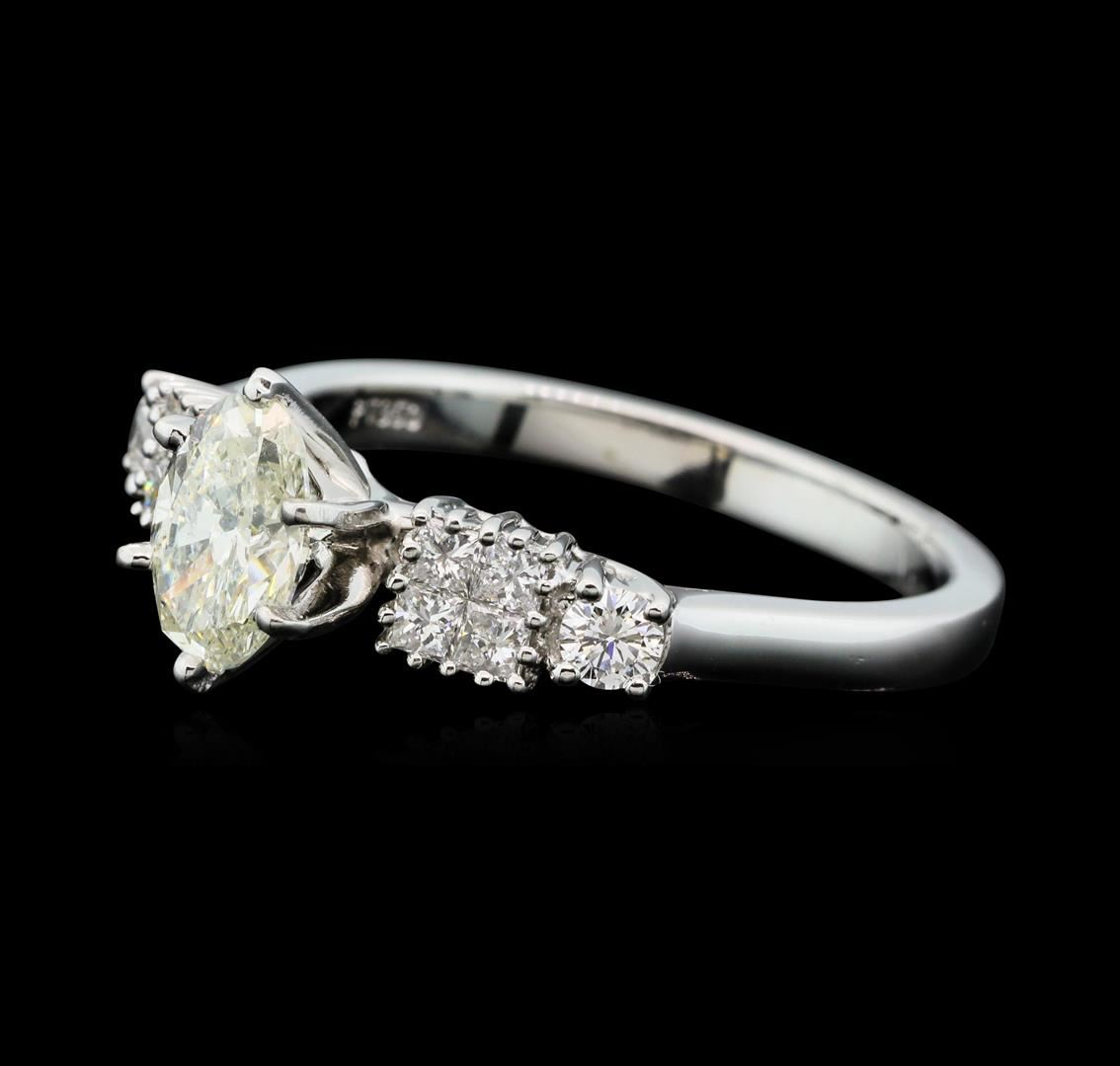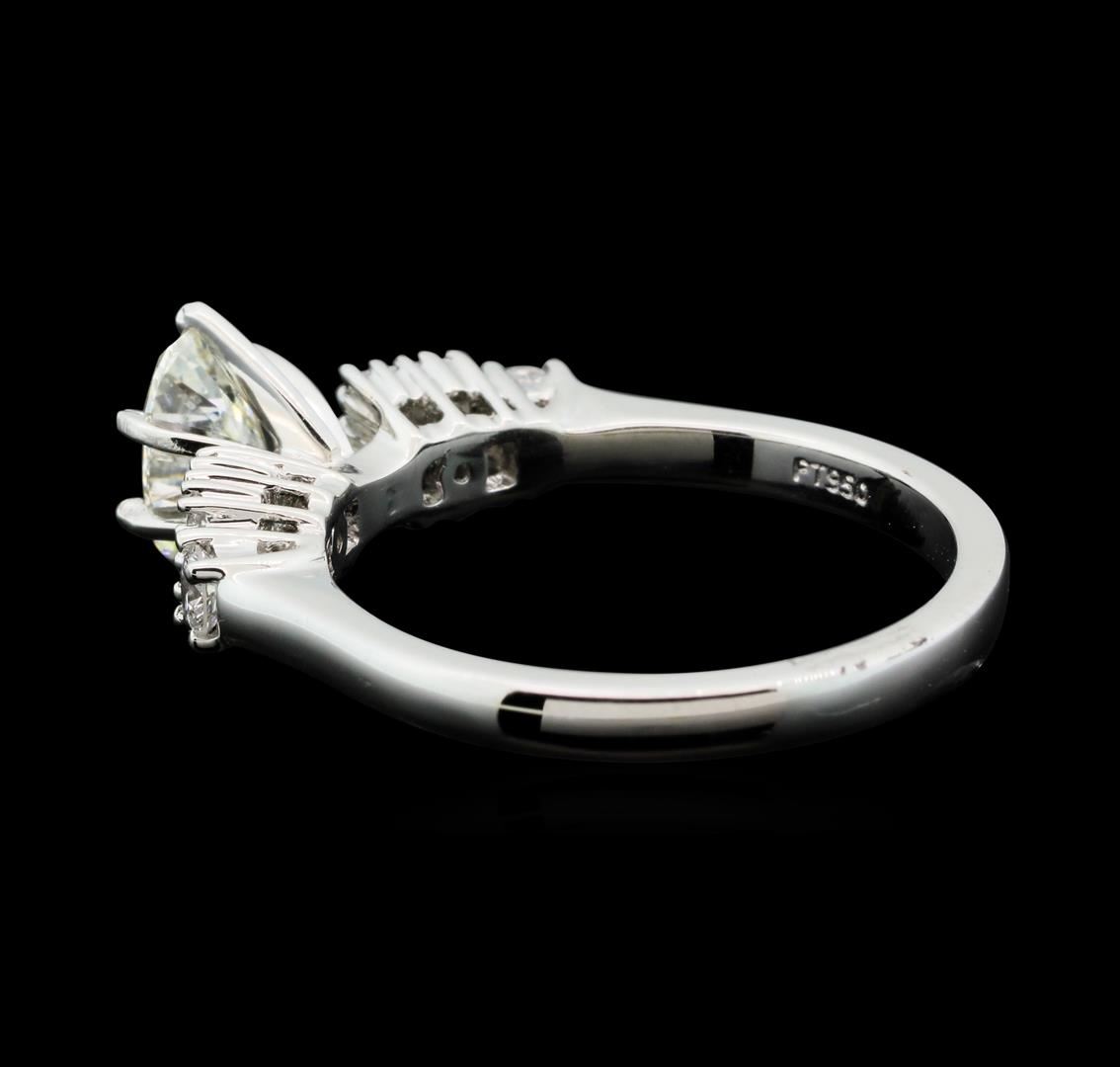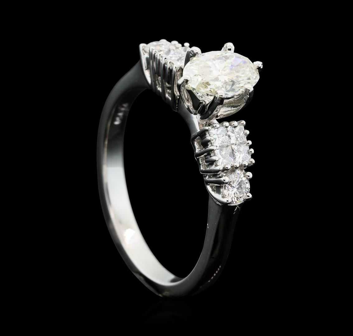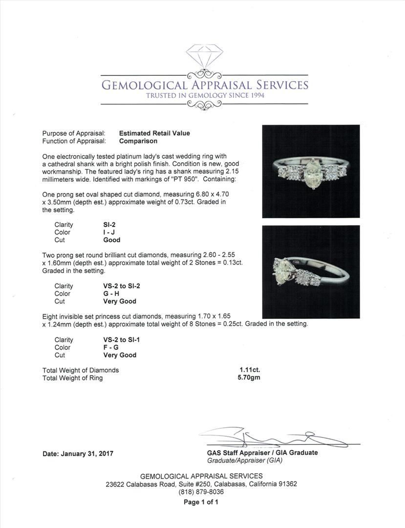One electronically tested platinum lady's cast wedding ring with a cathedral shank with a bright polish finish. The featured lady's ring has a shank measuring 2.15 millimeters wide. Identified with markings of "PT 950". Condition is new, good workmanship. Containing: One prong set oval shaped cut diamond, measuring 6.80 x 4.70 x 3.50mm (depth est.) approximate weight of 0.73ct. Graded in the setting. Clarity: SI-2. Color: I - JCut Good Two prong set round brilliant cut diamonds, measuring 2.60 - 2.55 x 1.60mm (depth est.) approximate total weight of 2 Stones = 0.13ct. Graded in the setting. Clarity: VS-2 to SI-2. Color: G - HCut Very Good Eight invisible set princess cut diamonds, measuring 1.70 x 1.65 x 1.24mm (depth est.) approximate total weight of 8 Stones = 0.25ct. Graded in the setting. Clarity: VS-2 to SI-1. Color: F - GCut Very Good. Total Weight of Diamonds 1.11ct. Total Weight of Ring 5.70gm. GAS Appraised.