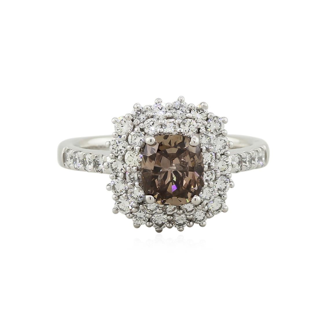 One electronically tested platinum ladies cast diamond ring with a bright polish finish. The featured diamond is set within a tiered diamond floret bezel supported by diamond set shoulders, completed by a two and one-half millimeter wide band. Trademark is Orianne. Identified with markings of "950". Condition is new, good workmanship. Containing: One prong set cushion cut diamond, measuring 6.65 x 5.70 x 3.39mm (depth est.) approximate weight of 1.13ct. Very faint pink secondary color throughout. Graded in the setting. Clarity: I-1. Depth: 54.9%. Table 59.9%. Forty prong set round brilliant cut diamonds approximate. Total Weight of 40 Stones = 0.89ct. Graded in the setting. Clarity: VS-1 to VS-2. Color: D - E. Total Weight of Diamonds 2.02ct. Total Weight of Ring 6.40gm. AIG Appraised at $14,060.00.