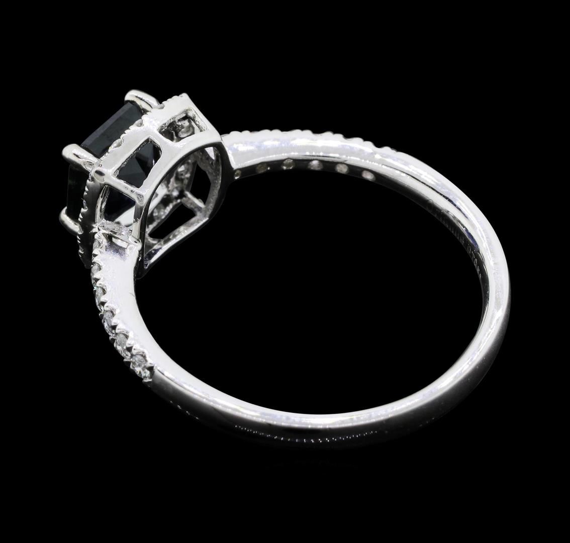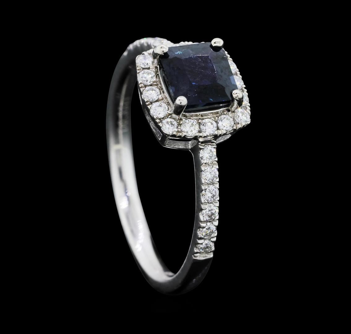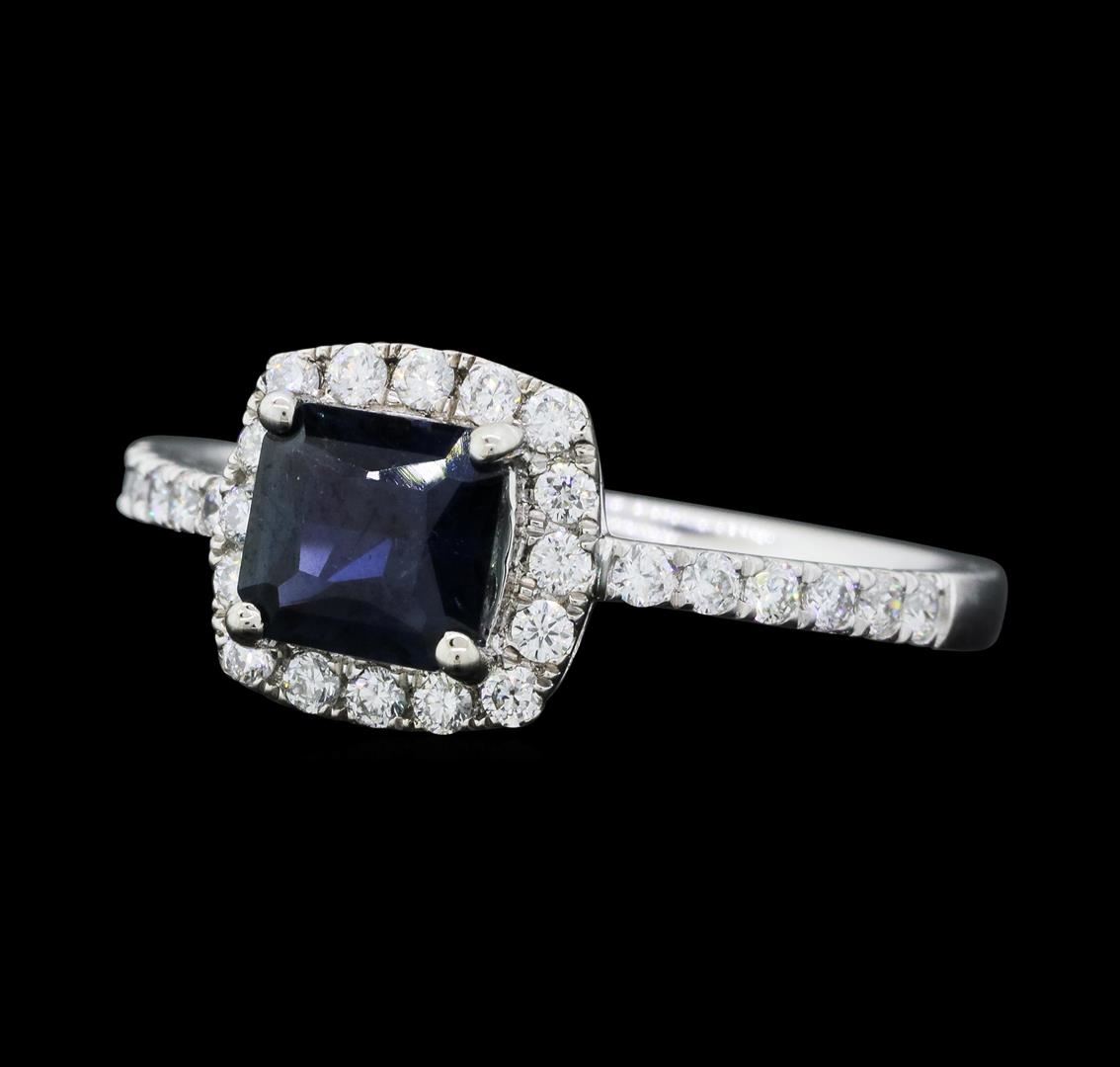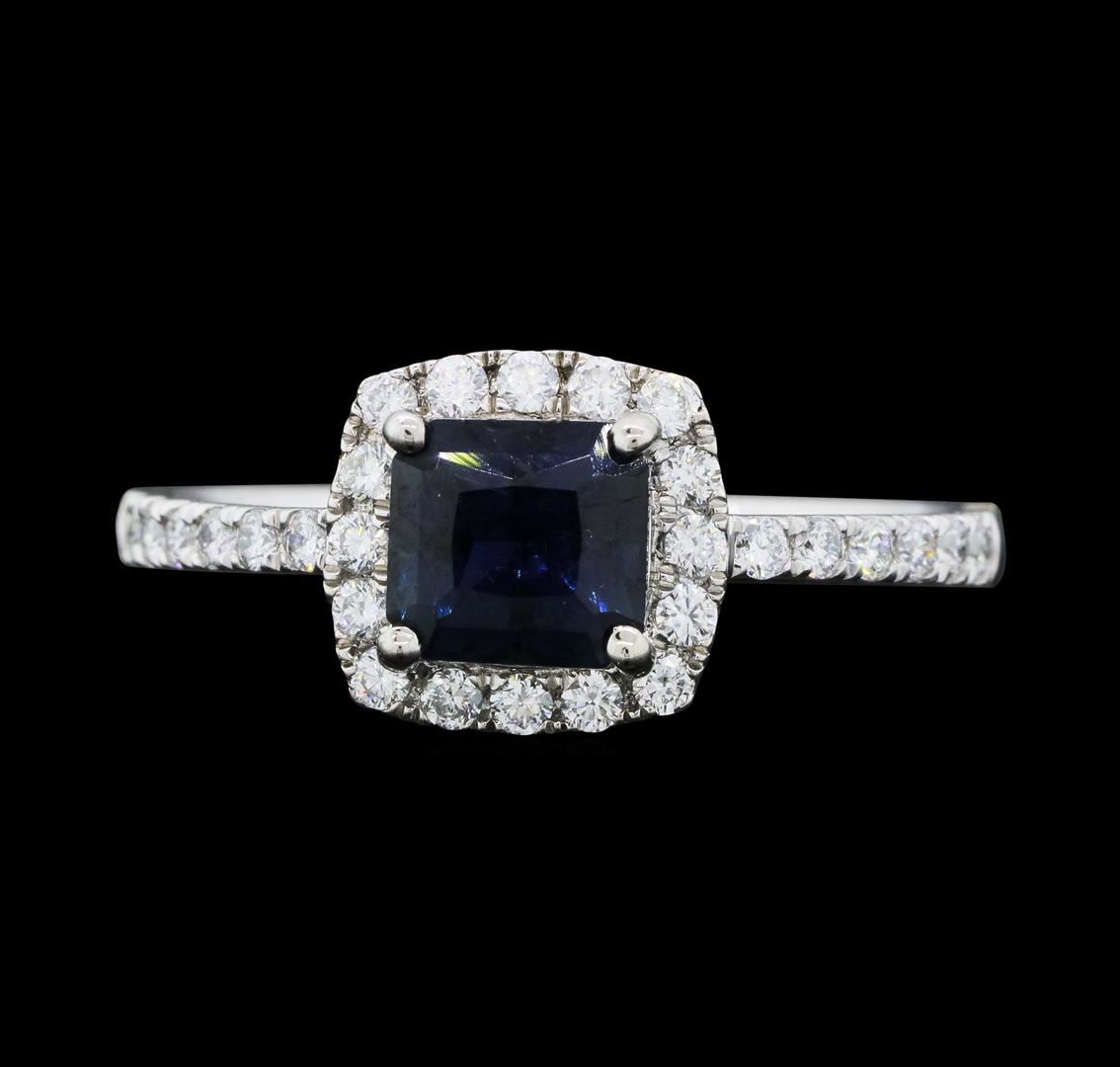 One electronically tested platinum ladies cast sapphire and diamond ring with a bright polish finish. The featured sapphire is set within a diamond bezel supported by diamond set shoulders, completed by a two millimeter wide band. Trademark is Orianne. Identified with markings of "PT950". Condition is new, good workmanship. Containing: One prong set rectangular step cut natural blue sapphire, measuring 5.80 x 5.50 x 3.65mm, approximate weight of 1.17ct., clarity is slightly included, type II, dark, moderately strong, blue color, (GIA B 7/4), cut is good. Transmitting light with a minimum of distortion, transparent. Naturally occurring internal & external characteristics are present. No indications of heating. Graded in the setting. Twenty-Eight prong set round brilliant cut diamonds approximate total weight of 28 Stones = 0.32ct. Graded in the setting. Clarity: VS-1 to VS-2. Color: E - G. Total Weight of Colored Stones 1.17ct. Total Weight of Diamonds 0.32ct. Total Weight of Ring 3.99gm. AIG Appraised.