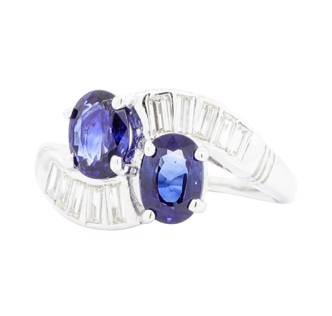 One electronically tested platinum lady's cast fashion ring with a bypass shank with a bright polish finish. The featured lady's ring has a shank measuring 1.32 millimeters wide. Identified with markings of 'PLAT'. Condition is like new, good workmanship. Containing: Two prong set oval modified mixed cut natural blue sapphires, measuring 6.92 x 5.05 x 2.89mm, (depth est.) approximate total weight of 1.70ct., clarity is eye clean, medium dark, moderately strong, blue color, (GIA B 6/4), cut is good. Transmitting light with no distortion, transparent. Colored gemstones are presumed to have been subjected to commonly used enhancement processes. Graded in the setting. Ten channel set baguette cut diamonds, measuring from 2.90 x 1.50 x 1.28mm (depth est.) to 3.40 x 1.70 x 1.45mm (depth est.) approximate total weight of 10 Stones = 0.60ct. Graded in the setting. Color H - I Clarity VS-1 to VS-2 Cut Very Good. Total Weight of Colored Stones 1.70ct.. Total Weight of Diamonds 0.60ct.. Total Weight of Ring 6.90gm GAS Appraised.