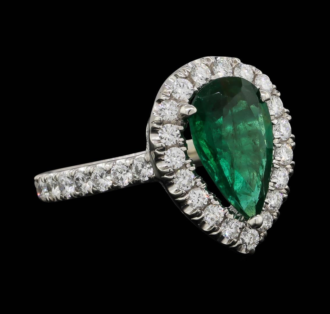 One electronically tested platinum lady's cast fashion ring with a cathedral shank with a basket halo with a bright polish finish. The featured lady's ring has a shank measuring 2.00 millimeters wide. Identified with markings of "PLAT 950". Condition is new, good workmanship. Containing: One prong set pear modified brilliant cut natural emerald, measuring 11.75 x 7.10 x 3.95mm, (depth est.) 5%. bulge factor, approximate weight of 1.90ct., clarity is heavily included, medium, moderately strong, very slightly bluish green color, (GIA vslbG 5/4), cut is good. Transmitting light somewhat diffusely, semi-transparent to translucent. Naturally occurring internal & external characteristics are present. Indications of oil residue. Colored gemstones are presumed to have been subjected to commonly used enhancement processes. Graded in the setting. Thirty-Five prong set round brilliant cut diamonds, measuring 1.90 - 1.80 x 1.13mm (depth est.) approximate total weight of 35 Stones = 0.83ct. Graded in the setting. Clarity: SI-1 to SI-2. Color: G - HCut Very Good. Total Weight of Colored Stones 1.90ct. Total Weight of Diamonds 0.83ct. Total Weight of Ring 7.60gm. GAS Appraised.