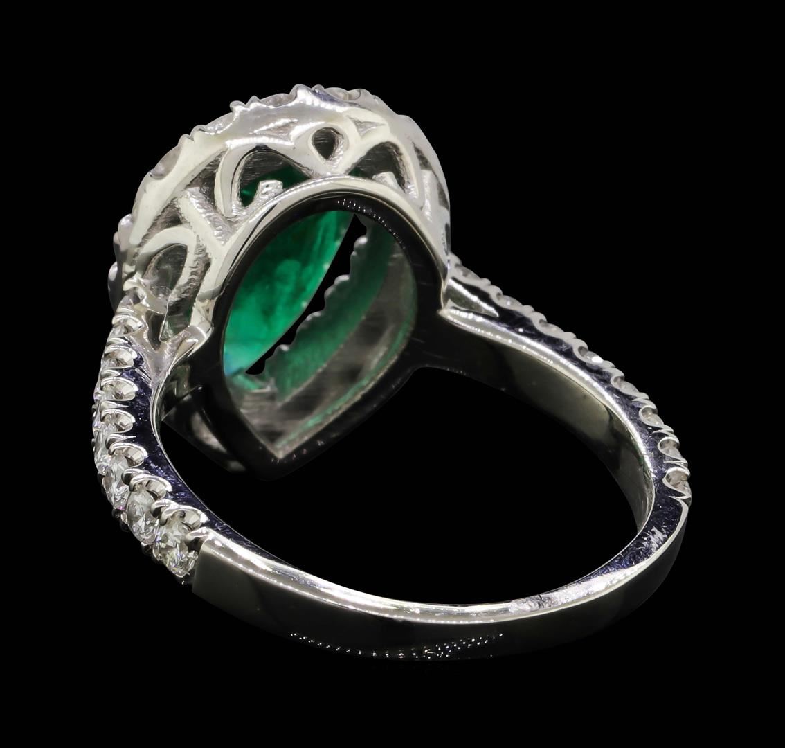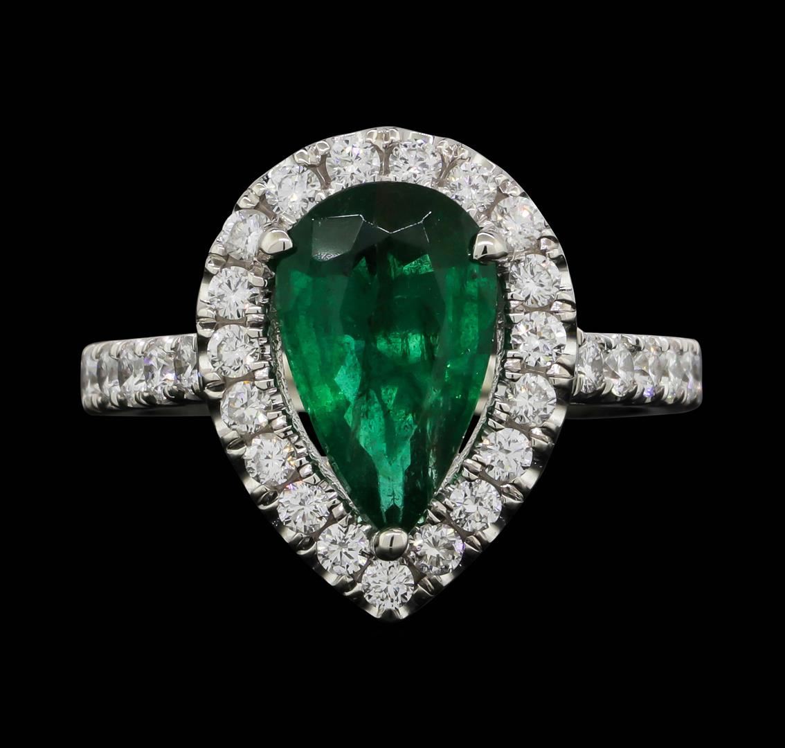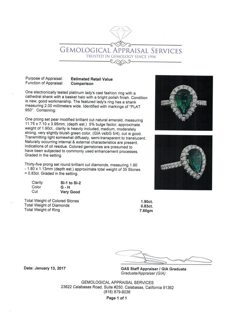 One electronically tested platinum lady's cast fashion ring with a cathedral shank with a basket halo with a bright polish finish. The featured lady's ring has a shank measuring 2.00 millimeters wide. Identified with markings of "PLAT 950". Condition is new, good workmanship. Containing: One prong set pear modified brilliant cut natural emerald, measuring 11.75 x 7.10 x 3.95mm, (depth est.) 5%. bulge factor, approximate weight of 1.90ct., clarity is heavily included, medium, moderately strong, very slightly bluish green color, (GIA vslbG 5/4), cut is good. Transmitting light somewhat diffusely, semi-transparent to translucent. Naturally occurring internal & external characteristics are present. Indications of oil residue. Colored gemstones are presumed to have been subjected to commonly used enhancement processes. Graded in the setting. Thirty-Five prong set round brilliant cut diamonds, measuring 1.90 - 1.80 x 1.13mm (depth est.) approximate total weight of 35 Stones = 0.83ct. Graded in the setting. Clarity: SI-1 to SI-2. Color: G - HCut Very Good. Total Weight of Colored Stones 1.90ct. Total Weight of Diamonds 0.83ct. Total Weight of Ring 7.60gm. GAS Appraised.