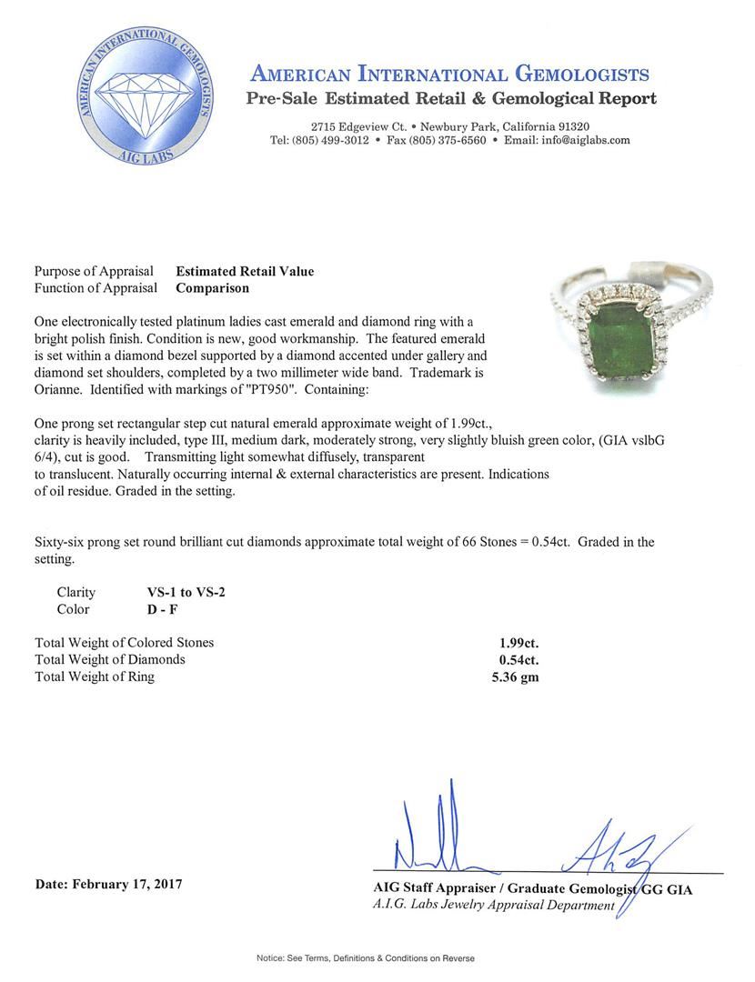 One electronically tested platinum ladies cast emerald and diamond ring with a bright polish finish. The featured emerald is set within a diamond bezel supported by a diamond accented under gallery and diamond set shoulders, completed by a two millimeter wide band. Trademark is Orianne. Identified with markings of "PT950". Condition is new, good workmanship. Containing: One prong set rectangular step cut natural emerald approximate weight of 1.99ct., clarity is heavily included, type III, medium dark, moderately strong, very slightly bluish green color, (GIA vslbG 6/4), cut is good. Transmitting light somewhat diffusely, transparent to translucent. Naturally occurring internal & external characteristics are present. Indications of oil residue. Graded in the setting. Sixty-Six prong set round brilliant cut diamonds approximate total weight of 66 Stones = 0.54ct. Graded in the setting. Clarity: VS-1 to VS-2. Color: D - F. Total Weight of Colored Stones 1.99ct. Total Weight of Diamonds 0.54ct. Total Weight of Ring 5.36gm. AIG Appraised.