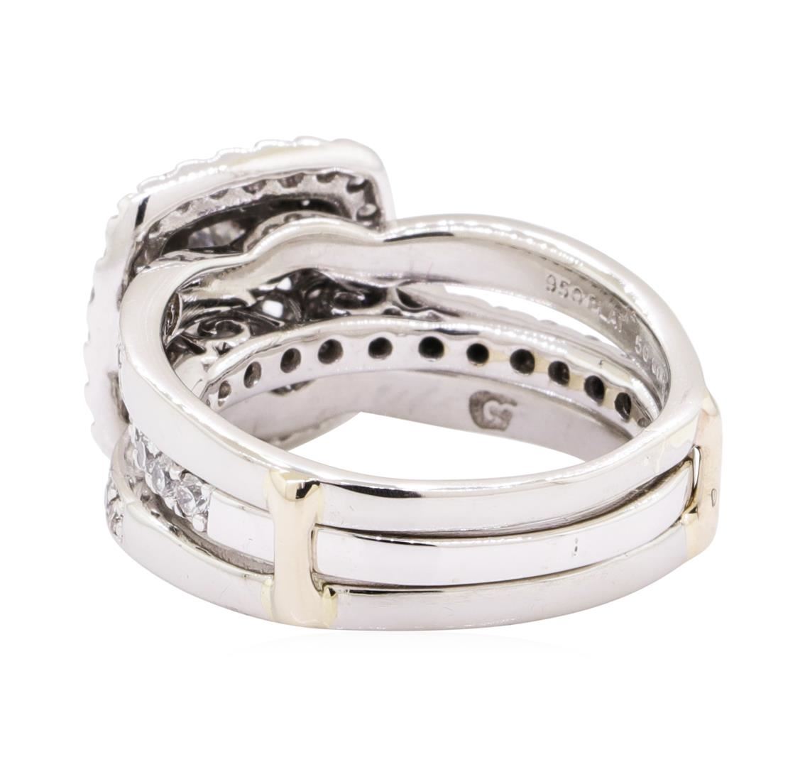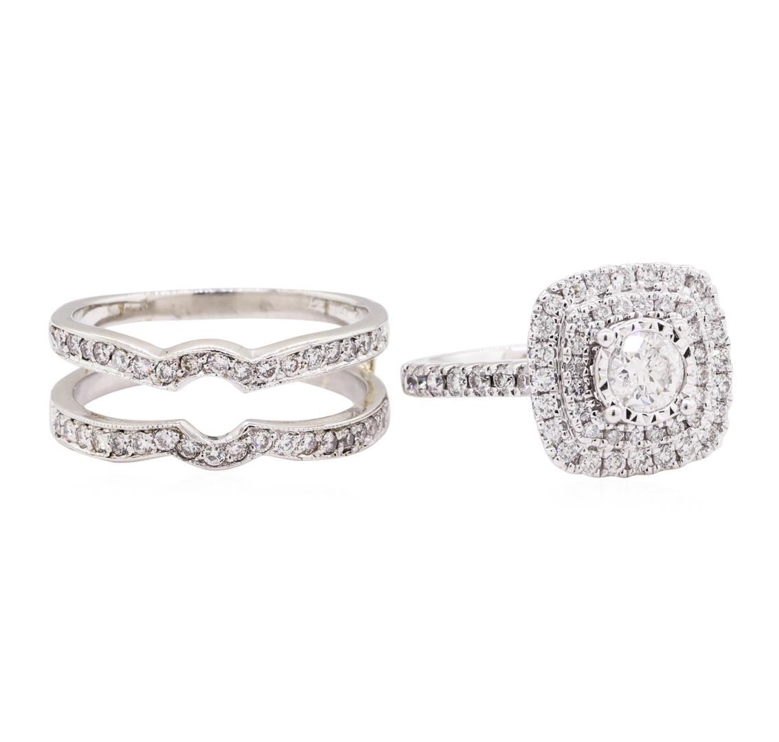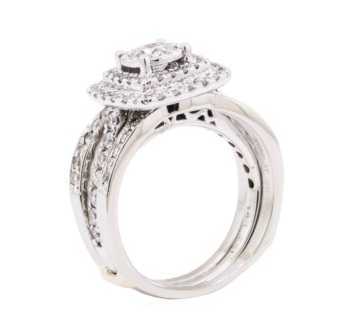 One set electronically tested platinum & 14KT white gold lady's combination cast & assembled engagement ring and ring guard with a bright polish with milgrain detailing finish. The featured lady's ring guard is cast and assembled in platinum, and the ring is cast in 14KT white gold. The ring set has a triple shank measuring 5.50 millimeters wide. Identified with markings of '14K / PLAT 950'. Condition is new, good workmanship. Containing: One prong set round brilliant cut diamond, measuring 4.80 - 4.75 x 3.01mm approximate weight of 0.45ct. Graded in the setting. Color H - I, Clarity I-1, Cut Good Fifty prong set round brilliant cut diamonds, measuring 1.70 - 1.50 x 0.99mm (depth est.) approximate total weight of 50 Stones = 0.80ct. Graded in the setting. Color H - I, Clarity SI-1 to SI-2, Cut Good Forty-Four prong set round brilliant cut diamonds, measuring 1.30 - 1.20 x 0.78mm (depth est.) approximate total weight of 44 Stones = 0.34ct. Graded in the setting. Color H - I, Clarity SI-1 to SI-2, Cut Good. Total Weight of Diamonds 1.59ct. Total Weight of Ring And Ring Guard 9.20gm. GAS Appraised.
