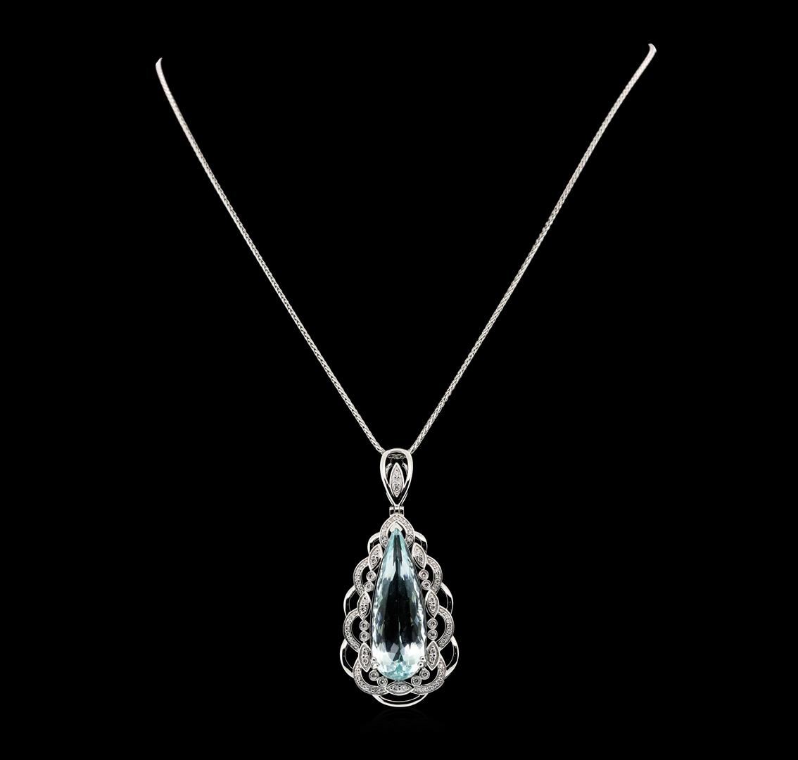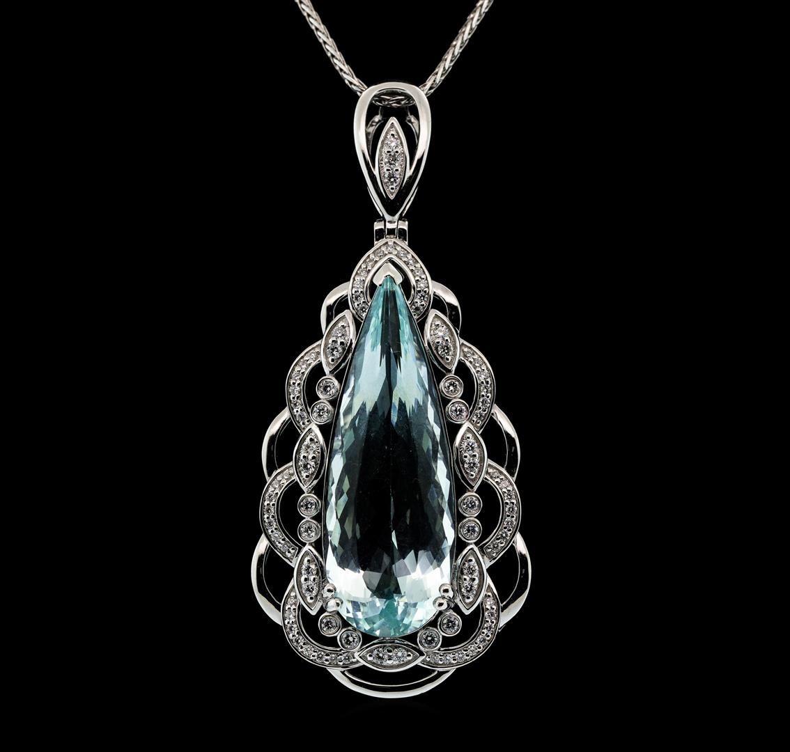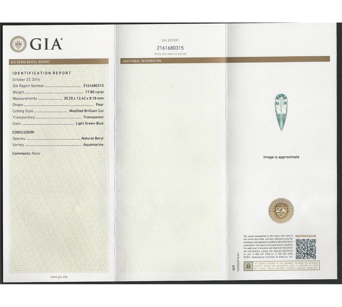 One electronically tested platinum ladies cast & assembled aquamarine and diamond pendant with chain. The pendant features an aquamarine is set within a scalloped diamond bezel, completed by a stylized diamond accented bail. The pendant is supported by an eighteen inch length platinum designer style chain, terminating in a lobster claw clasp. Bright polish finish. Trademark is A. I. Identified with markings of "PT950". Condition is new, good workmanship. Containing: One prong set pear modified brilliant cut natural aquamarine, measuring 35.20 x 12.42 x 8.18mm, exact weight 17.80ct., type I Clarity is eye clean, light, very slightly grayish, green-blue color, (GIA GB 3/3), cut is good. Transmitting light with no distortion, transparent. GIA Gemological Report attached. Graded loose prior to setting in the GIA Laboratory, Report # 2161680315.Eighty-Four prong set round brilliant cut diamonds approximate total weight of 84 Stones = 0.70ct. Graded in the setting. Clarity: VS-1 to VS-2. Color: D - F. Total Weight of Colored Stones 17.80ct. Total Weight of Diamonds 0.70ct. Total Weight of Pendant With Chain 24.02gm. AIG Appraised.