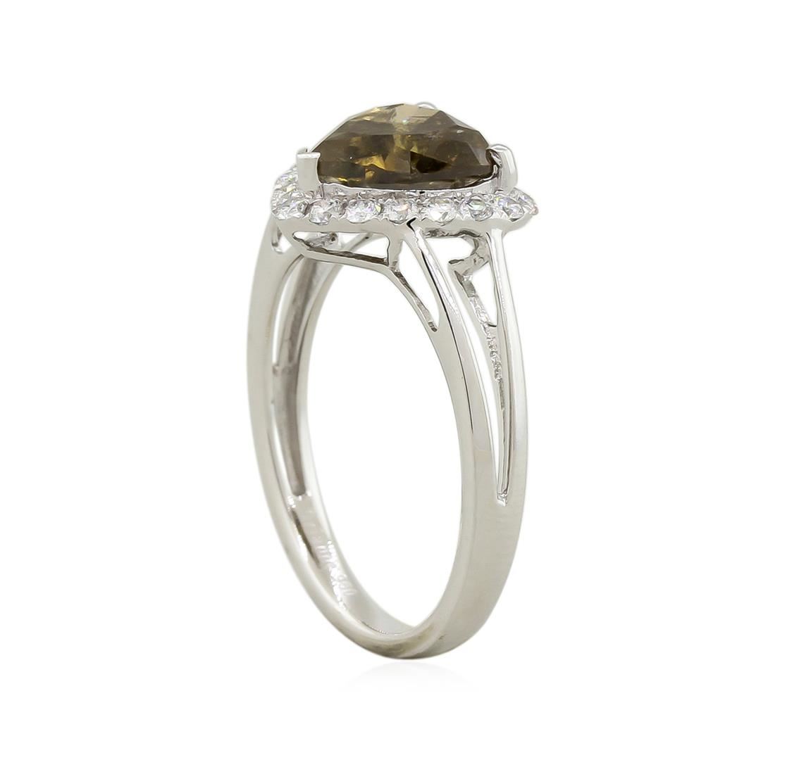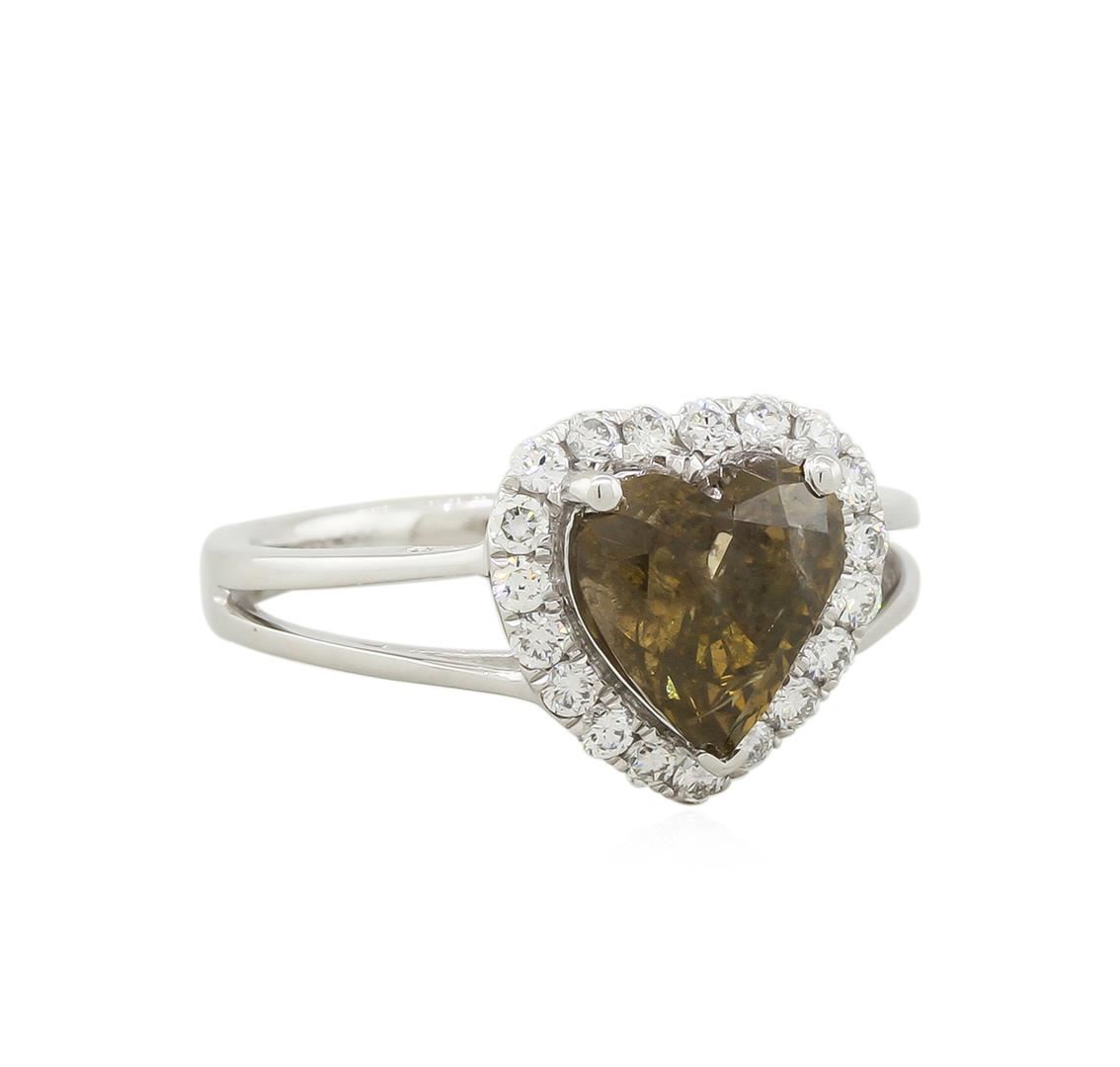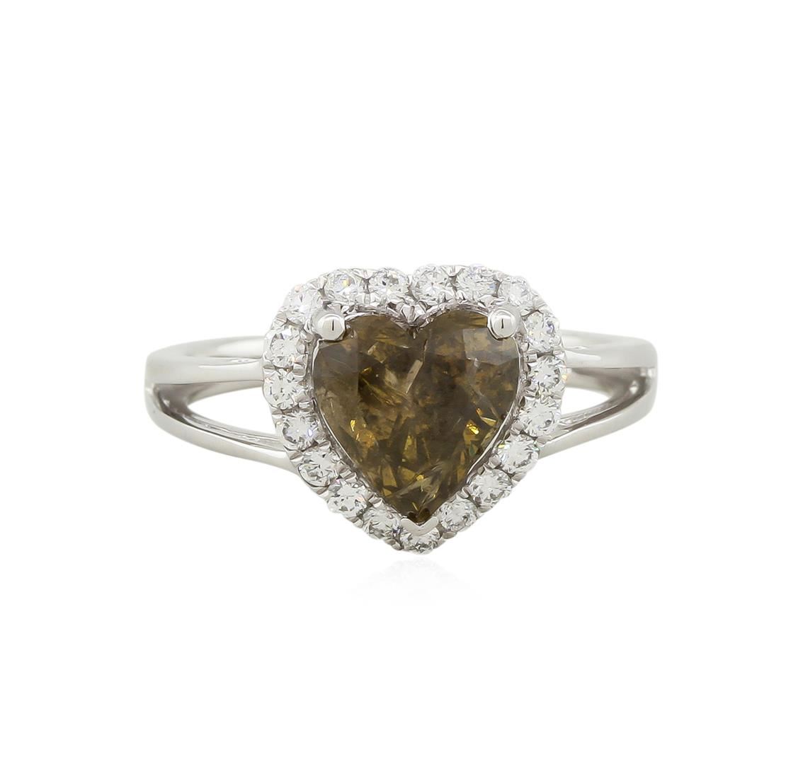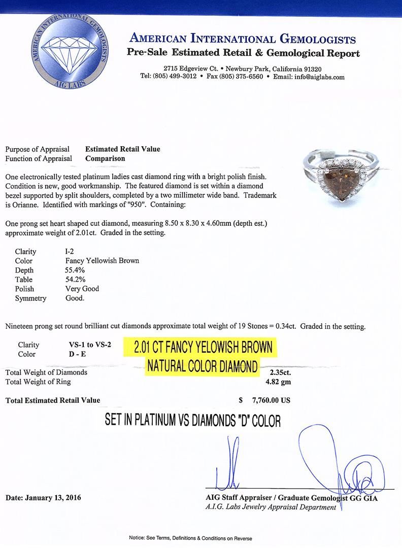 One electronically tested platinum ladies cast diamond ring with a bright polish finish. The featured diamond is set within a diamond bezel supported by split shoulders, completed by a two millimeter wide band. Trademark is Orianne. Identified with markings of "950". Condition is new, good workmanship. Containing: One prong set heart shaped cut diamond, measuring 8.50 x 8.30 x 4.60mm (depth est.) approximate weight of 2.01ct. Graded in the setting. Clarity I-2. Color: Fancy Yellowish Brown. Depth: 55.4%. Table: 54.2%. Polish Very Good Symmetry Good. Nineteen prong set round brilliant cut diamonds approximate. Total Weight of 19 Stones = 0.34ct. Graded in the setting. Clarity: VS-1 to VS-2. Color: D - E. Total Weight of Diamonds 2.35ct. Total Weight of Ring 4.82gm. AIG Appraised at $7,760.00.