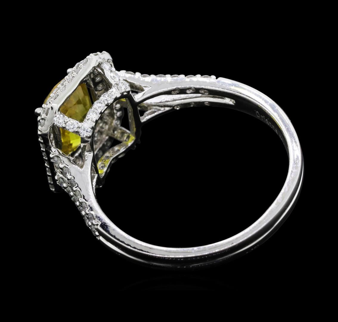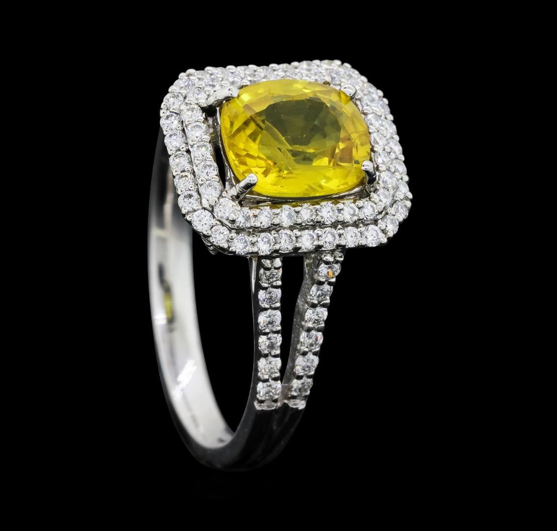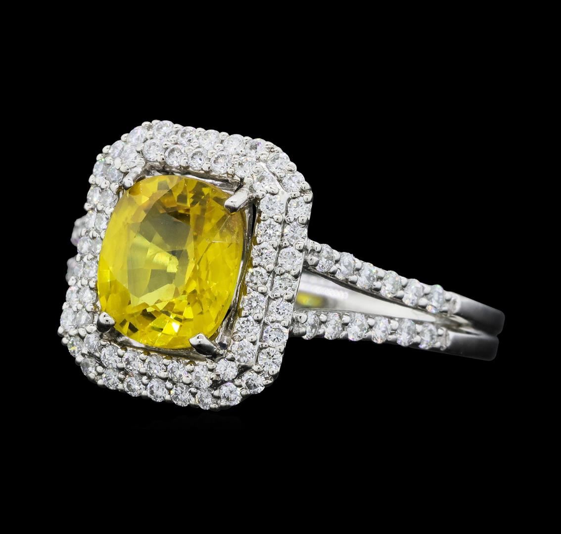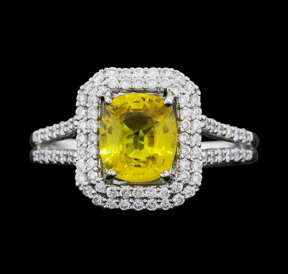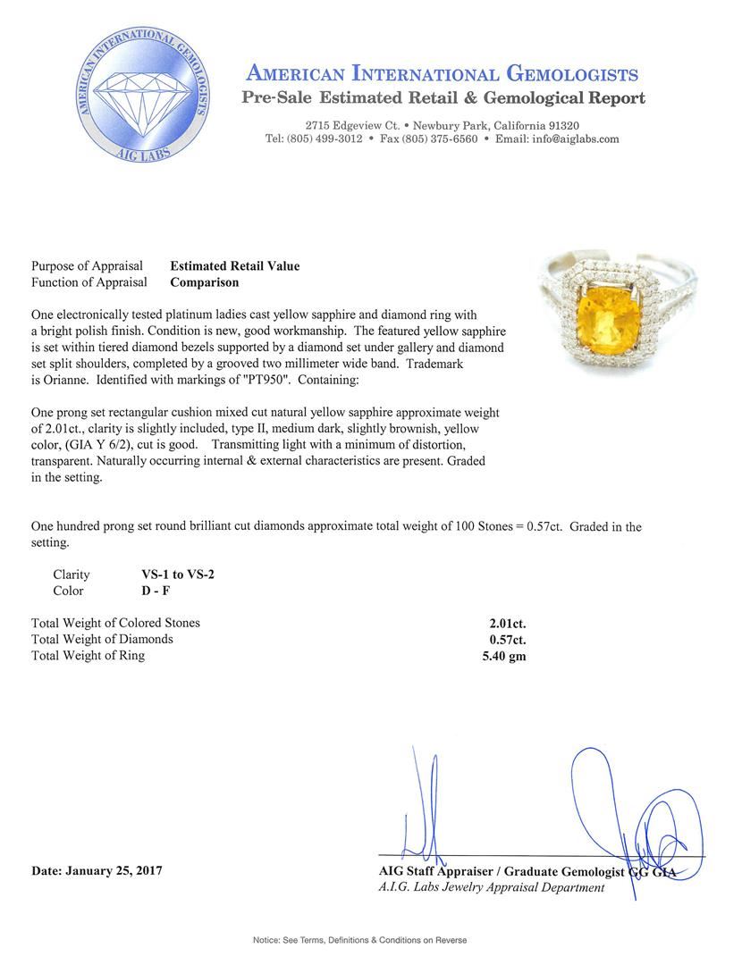One electronically tested platinum ladies cast yellow sapphire and diamond ring with a bright polish finish. The featured yellow sapphire is set within tiered diamond bezels supported by a diamond set under gallery and diamond set split shoulders, completed by a grooved two millimeter wide band. Trademark is Orianne. Identified with markings of "PT950". Condition is new, good workmanship. Containing: One prong set rectangular cushion mixed cut natural yellow sapphire approximate weight of 2.01ct., clarity is slightly included, type II, medium dark, slightly brownish, yellow color, (GIA Y 6/2), cut is good. Transmitting light with a minimum of distortion, transparent. Naturally occurring internal & external characteristics are present. Graded in the setting. One Hundred prong set round brilliant cut diamonds approximate total weight of 100 Stones = 0.57ct. Graded in the setting. Clarity: VS-1 to VS-2. Color: D - F. Total Weight of Colored Stones 2.01ct. Total Weight of Diamonds 0.57ct. Total Weight of Ring 5.40gm. AIG Appraised.