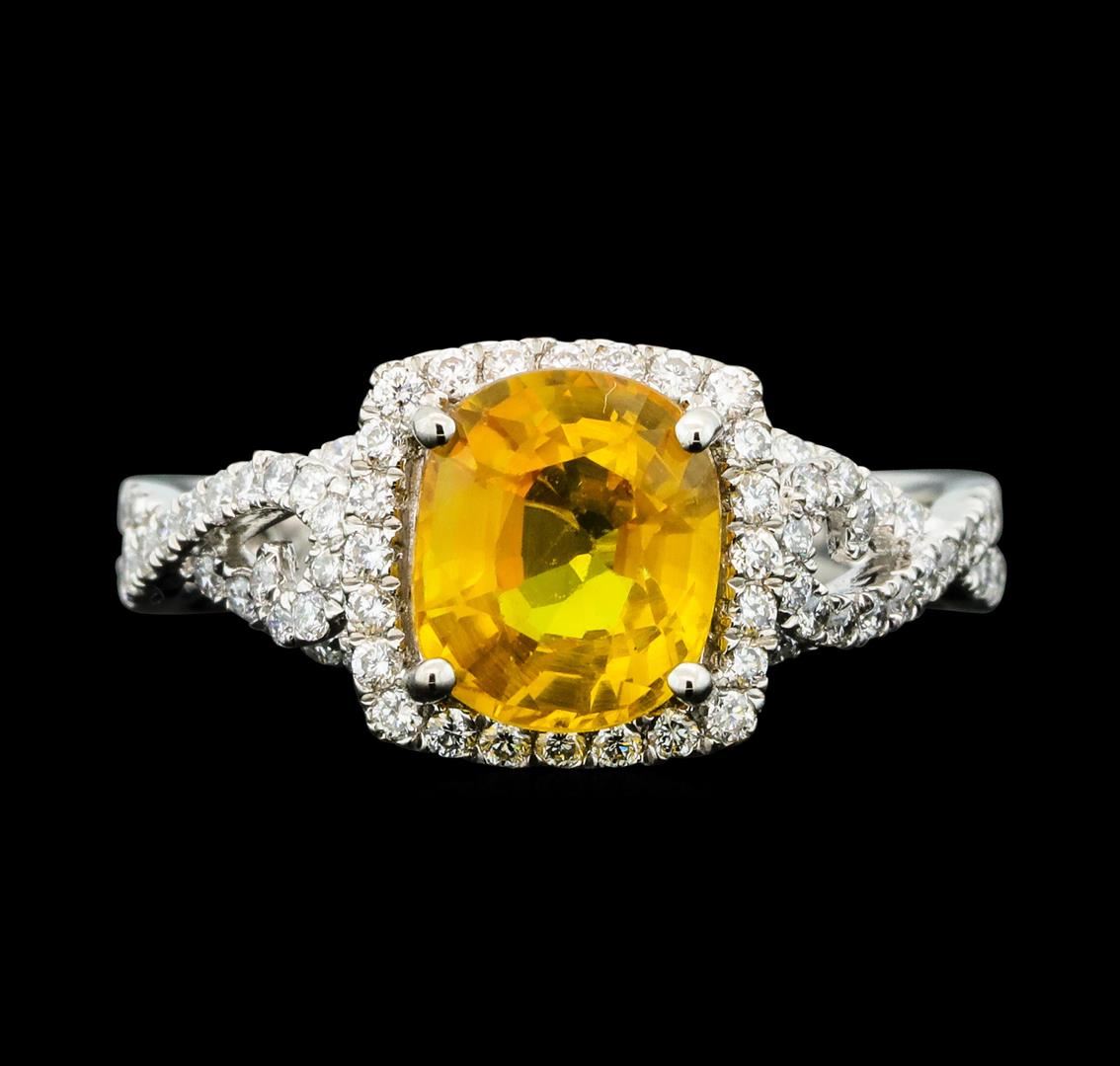 One electronically tested platinum ladies cast yellow sapphire and diamond ring with a bright polish finish. The featured yellow sapphire is set within a diamond bezel supported by elaborate diamond set intertwining shoulders, completed by a three millimeter wide band. Trademark is Orianne. Identified with markings of "PT950". Condition is new, good workmanship. Containing: One prong set oval mixed cut natural yellow sapphire approximate weight of 2.37ct., clarity is eye clean, type II, medium dark, slightly brownish, orangy yellow color, (GIA oY 6/2), cut is good. Transmitting light with no distortion, transparent. Graded in the setting.Ninety-Four prong set round brilliant cut diamonds approximate total weight of 94 Stones = 0.52ct. Graded in the setting. Clarity: VS-1 to VS-2. Color: D - F. Total Weight of Colored Stones 2.37ct. Total Weight of Diamonds 0.52ct. Total Weight of Ring 5.71gm. AIG Appraised.