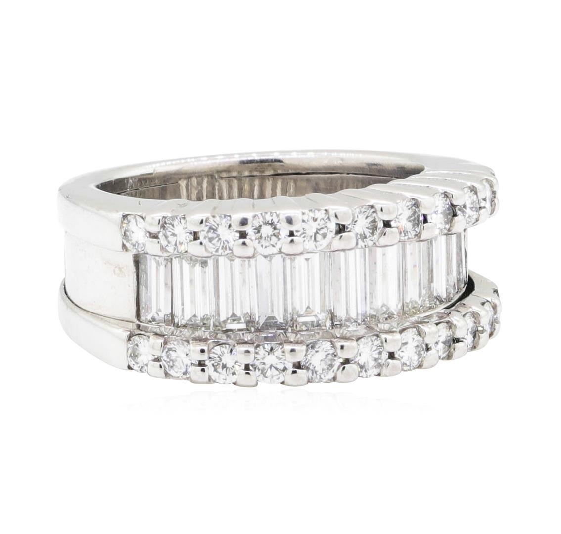 One electronically tested platinum Ladies cast fashion wedding band with a three row wide band with a bright polish finish. The featured Ladies ring has a shank measuring 6.3 millimeters in width. Identified with markings of 'PLAT'. Condition is new, good workmanship. Containing: Eleven channel set baguette cut diamonds, measuring from 3.85 x 2.00 x 1.70mm (depth est.) to 4.00 x 2.40 x 2.04mm (depth est.) approximate total weight of 11 Stones = 1.80ct. Graded in the setting. Color G - H Clarity VS-1 to VS-2 Cut Very Good Twenty-Two prong set round brilliant cut diamonds, measuring 2.00 - 1.95 x 1.21mm (depth est.) approximate total weight of 22 Stones = 0.65ct. Graded in the setting. Color G - H Clarity VS-2 to SI-1 Cut Very Good. Total Weight of Diamonds 2.45ct.. Total Weight of Wedding Band 17.20gm. GAS Appraised.