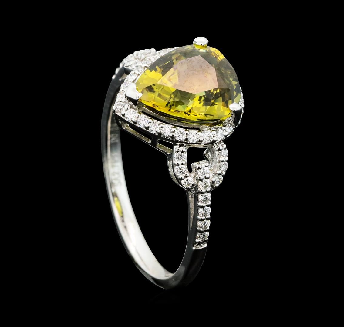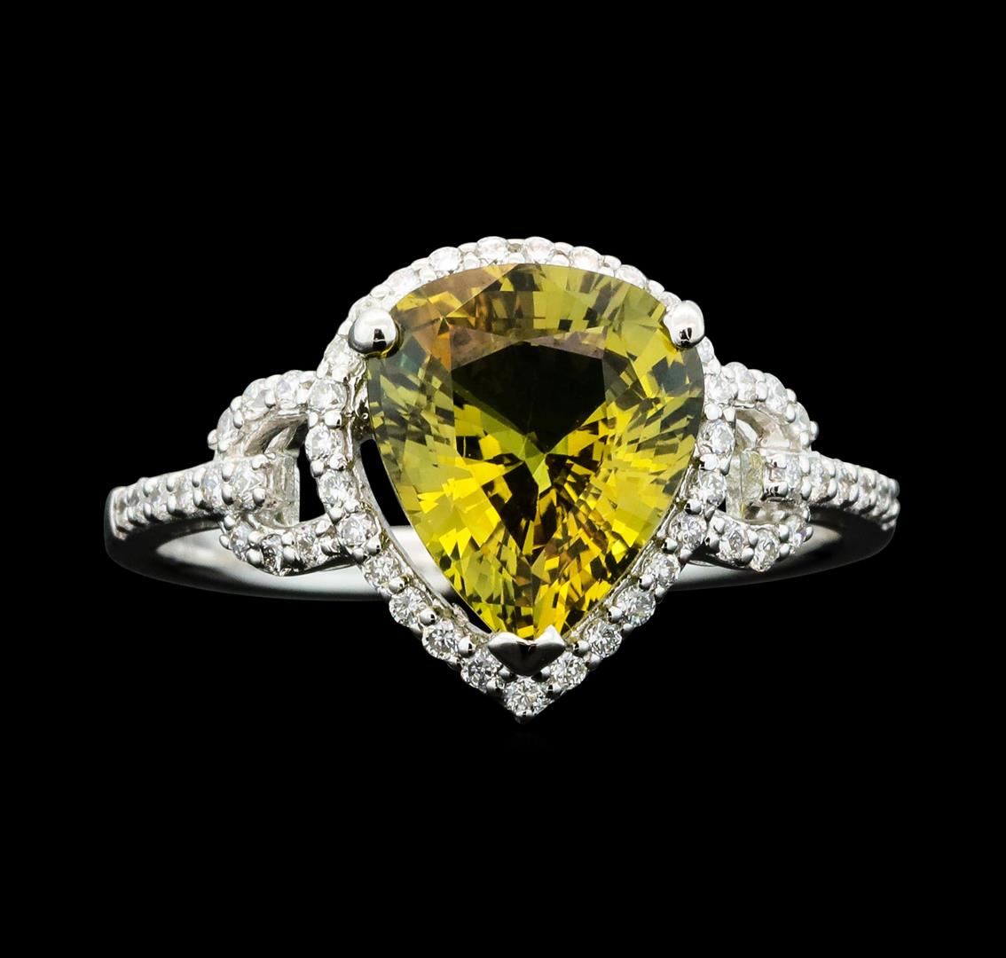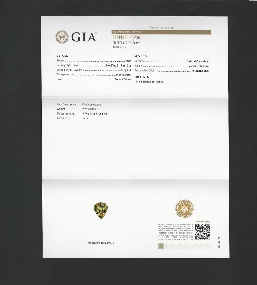 One electronically tested platinum ladies cast brown-yellow sapphire and diamond ring with a bright polish finish. The featured brown-yellow sapphire is set within a diamond bezel supported by stylized diamond set shoulders, completed by a one and one-half millimeter wide band. Trademark is A. I. Identified with markings of "PT950". Condition is new, good workmanship. Containing: One prong set pear modified mixed cut natural brown-yellow sapphire, measuring 9.74 x 8.31 x 4.66mm, exact weight 2.79ct. Clarity is eye clean, medium dark, very slightly grayish, brown-yellow color, (GIA BrY 6/3), cut is good. Transmitting light with no distortion, transparent. No indications of heating. GIA Gemological Report attached. Graded loose prior to setting in the GIA Laboratory, Report #2237780059.Fifty-One prong set round brilliant cut diamonds approximate total weight of 51 Stones = 0.28ct. Graded in the setting. Clarity: VS-1 to VS-2. Color: D - F. Total Weight of Colored Stones 2.79ct. Total Weight of Diamonds 0.28ct. Total Weight of Ring 4.32gm. AIG Appraised.
