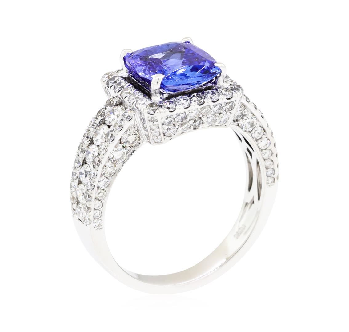 One electronically tested platinum lady's cast 3-stone fashion ring with a bright polish finish. The featured lady's ring has a shank measuring 2.20 millimeters wide. Identified with markings of 'PLAT'. Condition is new, good workmanship. Containing: One prong set square cushion modified mixed cut natural blue sapphire, measuring 6.58 x 6.53 x 3.40mm, (depth est.) approximate weight of 1.48ct., clarity is eye clean, medium, very slightly grayish, blue color, (GIA B 5/3), cut is good. Transmitting light with no distortion, transparent. Colored gemstones are presumed to have been subjected to commonly used enhancement processes. Graded in the setting. Two prong set triangle brilliant cut diamonds, measuring 5.00 x 4.50 x 2.00mm (depth est.) approximate total weight of 2 Stones = 0.50ct. Graded in the setting. Color F - G Clarity VS-2 to SI-1 Cut Good. Total Weight of Colored Stones 1.48ct.. Total Weight of Diamonds 0.50ct.. Total Weight of Ring 5.50gm. GAS Appraised.
