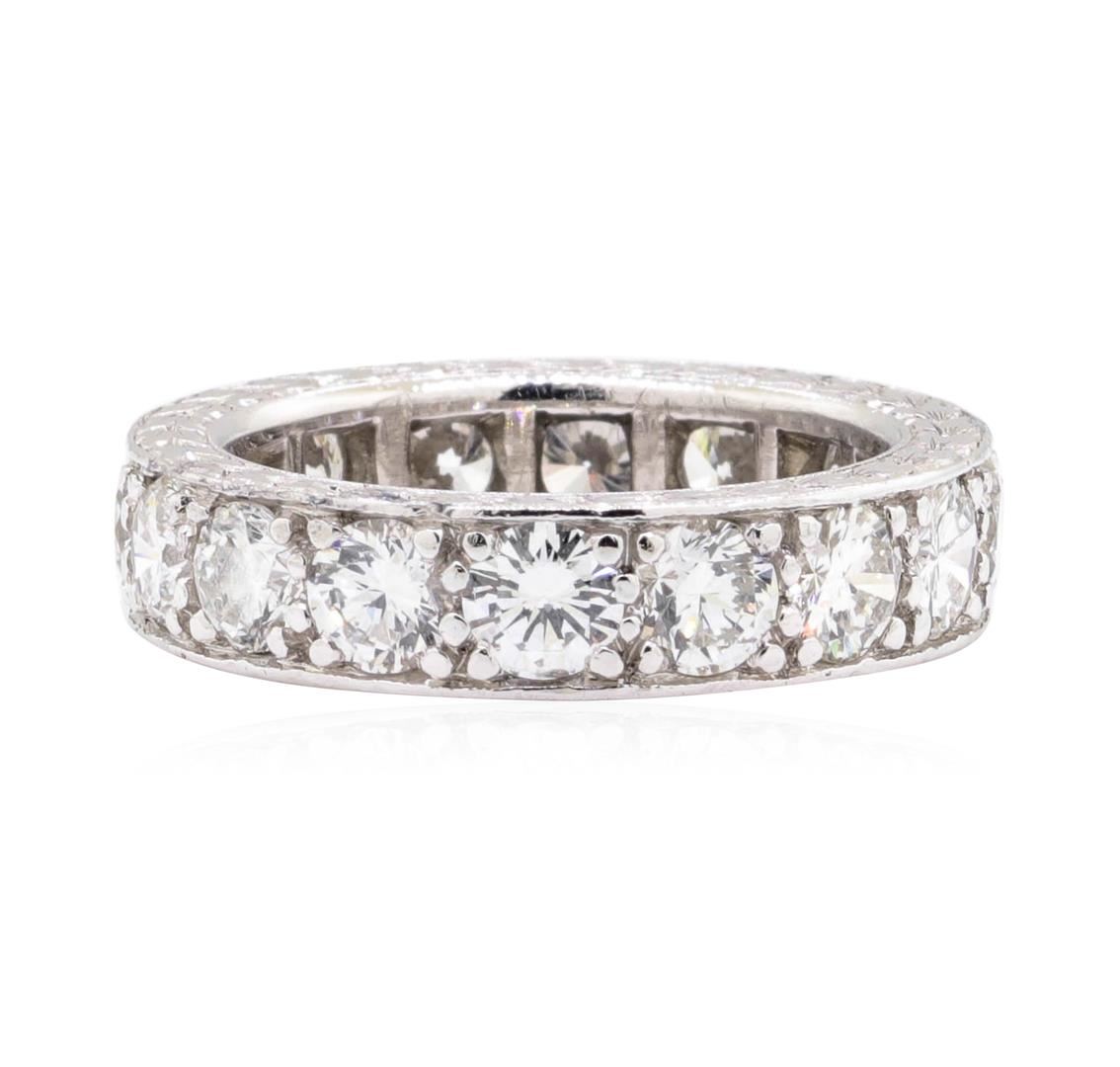 One electronically tested platinum Ladies cast fashion eternity ring with a bright polish, hand-engraved detail finish. The featured Ladies ring has a finger size of 6 and a shank measuring 4.90 millimeters in width. Condition is new, good workmanship. Containing: Sixteen prong set round brilliant cut diamonds, measuring 3.90 - 3.85 x 2.37mm (depth est.) approximate total weight of 16 Stones = 3.80ct. Graded in the setting. Color G - I Clarity VS-2 to SI-1 Cut Good. Total Weight of Diamonds 3.80ct.. Total Weight of Eternity Ring 9.80gm. GAS Appraised.