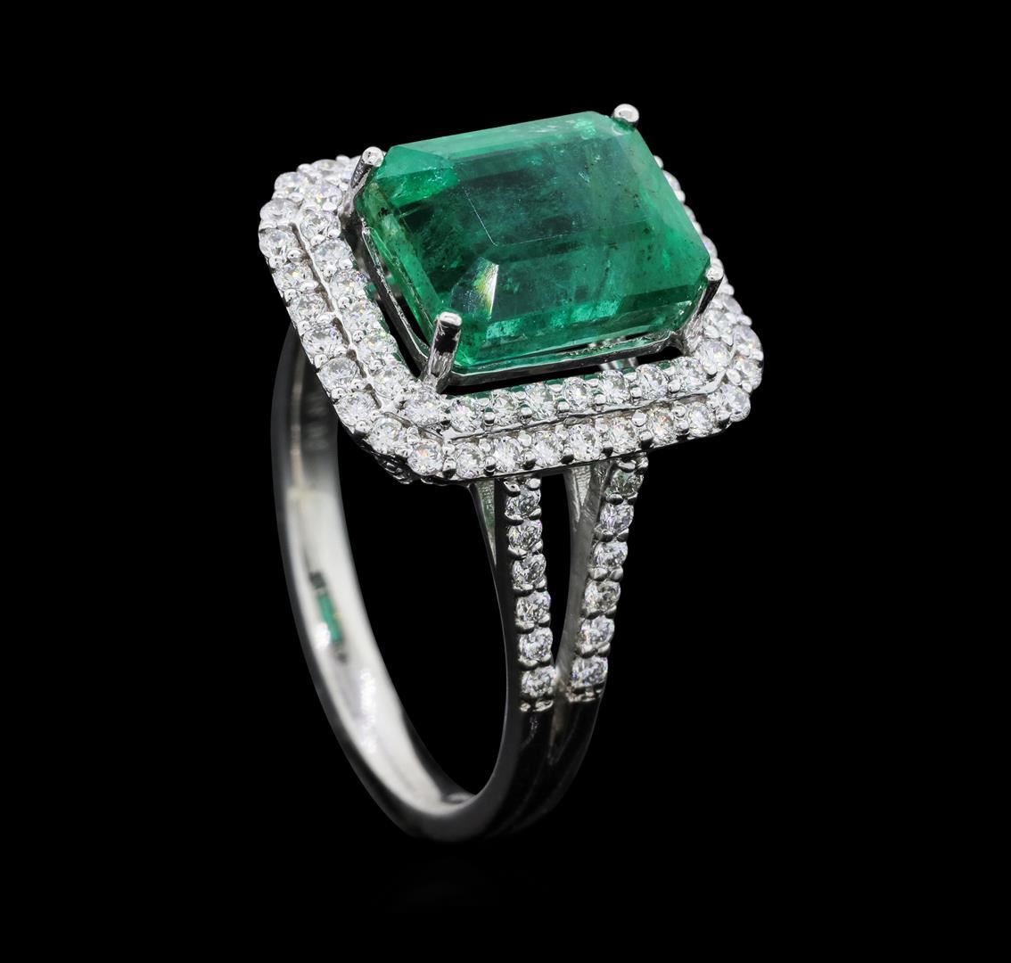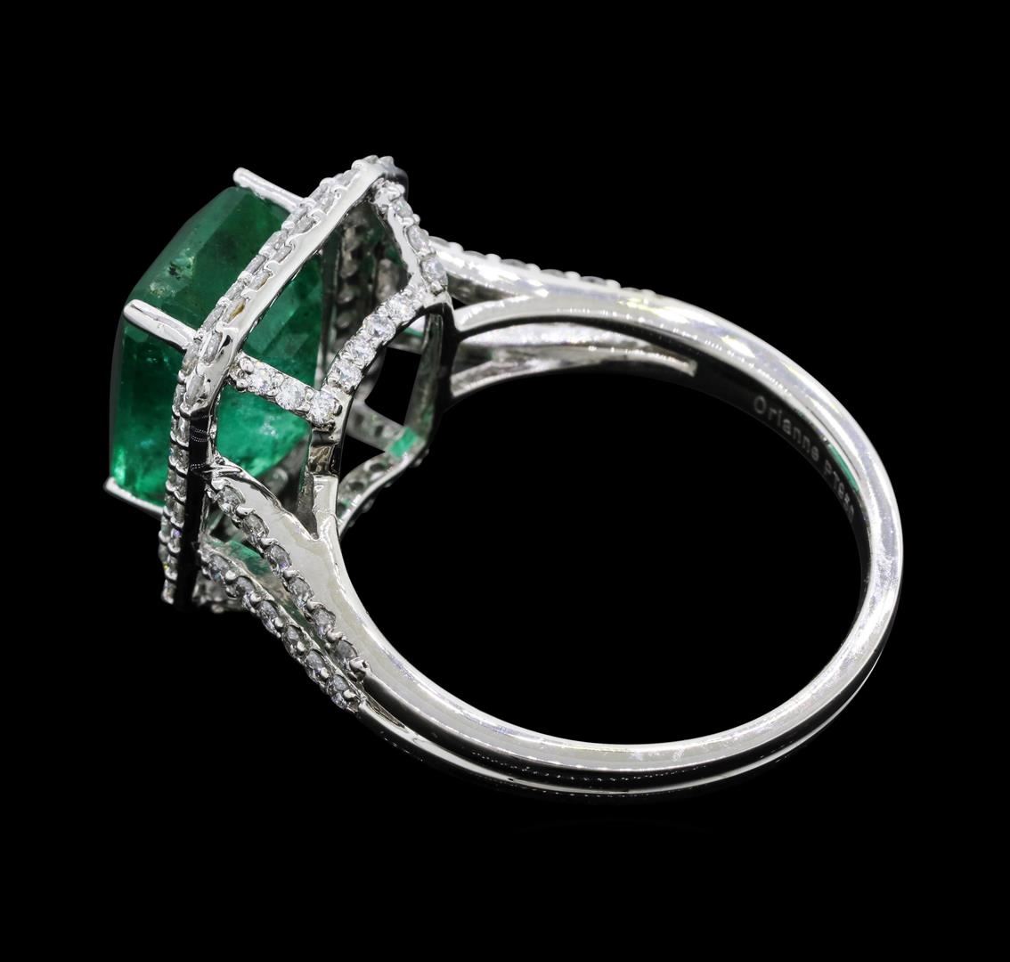 One electronically tested platinum ladies cast emerald and diamond ring with a bright polish finish. The featured emerald is set within two tiered diamond bezels supported by a diamond set under gallery and diamond set split shoulders, completed by a grooved two millimeter wide band. Trademark is Orianne. Identified with markings of "PT950". Condition is new, good workmanship. Containing: One prong set rectangular step cut natural emerald approximate weight of 4.29ct., clarity is moderately included, type III, medium, moderately strong, very slightly bluish green color, (GIA vlog 5/4), cut is good. Transmitting light with no distortion, transparent. Naturally occurring internal & external characteristics are present. Indications of oil residue. Graded in the setting. One Hundred Eight prong set round brilliant cut diamonds approximate total weight of 108 Stones = 0.80ct. Graded in the setting. Clarity: VS-1 to VS-2. Color: D - F. Total Weight of Colored Stones 4.29ct. Total Weight of Diamonds 0.80ct. Total Weight of Ring 6.67gm. AIG Appraised.