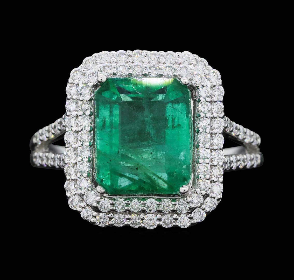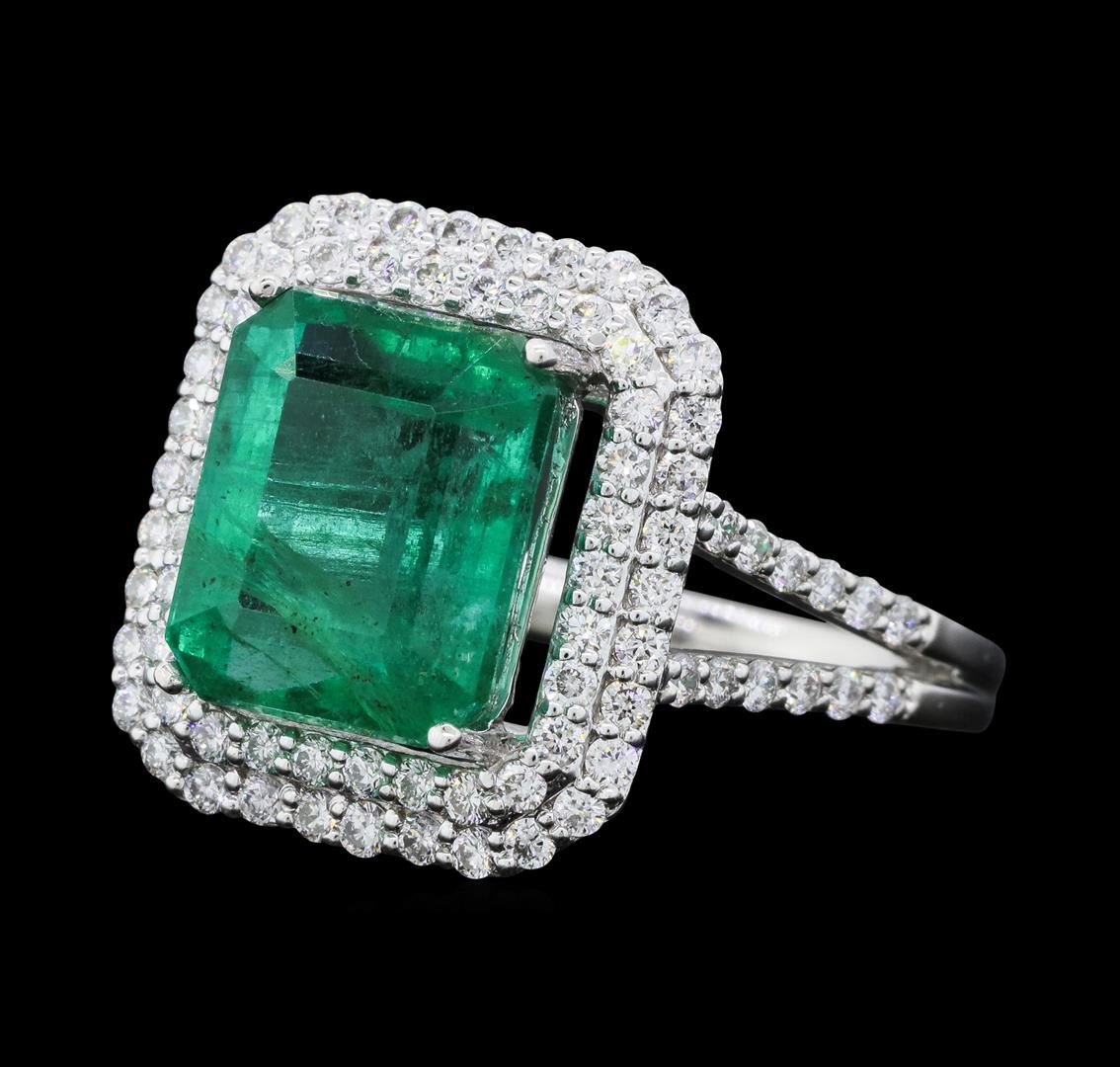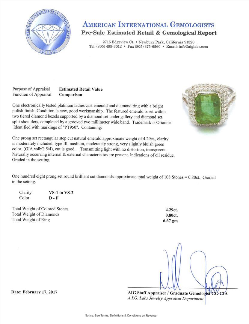 One electronically tested platinum ladies cast emerald and diamond ring with a bright polish finish. The featured emerald is set within two tiered diamond bezels supported by a diamond set under gallery and diamond set split shoulders, completed by a grooved two millimeter wide band. Trademark is Orianne. Identified with markings of "PT950". Condition is new, good workmanship. Containing: One prong set rectangular step cut natural emerald approximate weight of 4.29ct., clarity is moderately included, type III, medium, moderately strong, very slightly bluish green color, (GIA vlog 5/4), cut is good. Transmitting light with no distortion, transparent. Naturally occurring internal & external characteristics are present. Indications of oil residue. Graded in the setting. One Hundred Eight prong set round brilliant cut diamonds approximate total weight of 108 Stones = 0.80ct. Graded in the setting. Clarity: VS-1 to VS-2. Color: D - F. Total Weight of Colored Stones 4.29ct. Total Weight of Diamonds 0.80ct. Total Weight of Ring 6.67gm. AIG Appraised.