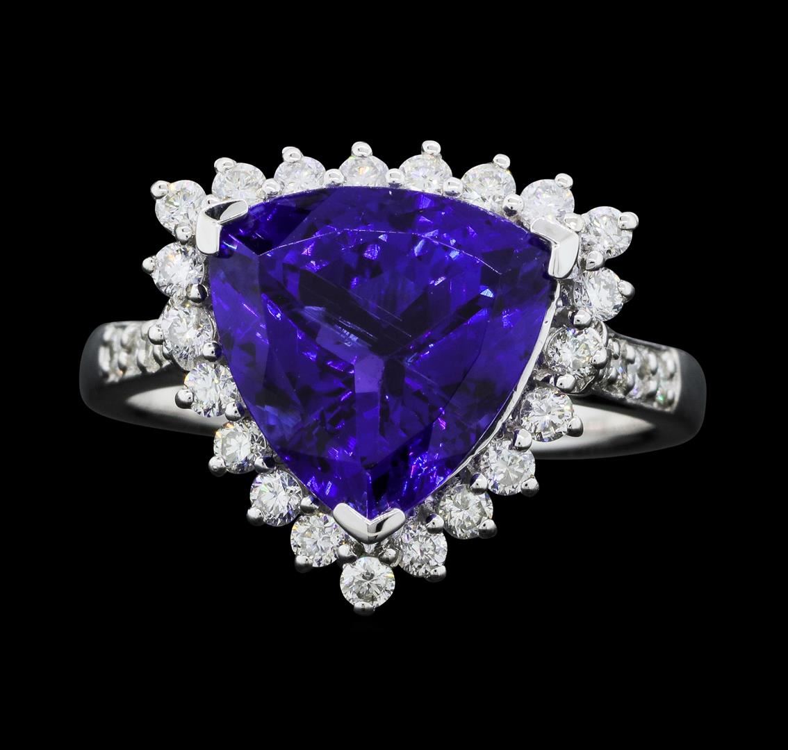 One electronically tested platinum ladies cast tanzanite and diamond ring with a bright polish finish. The featured tanzanite is set within a diamond floret bezel supported by diamond set shoulders, completed by a two millimeter wide band. Trademark is Orianne. Identified with markings of "PT950". Condition is new, good workmanship. Containing: One prong set triangular modified brilliant cut natural tanzanite, measuring 11.05 x 10.96 x 6.85mm, exact weight 5.16ct., clarity is slightly included, type I, dark, moderately strong, violetish blue color, (GIA vB 7/4), cut is good. Transmitting light with a minimum of distortion, transparent. Naturally occurring internal & external characteristics are present. Naturally occurring internal & external characteristics are present. GIA Gemological Report attached. Graded loose prior to setting in the GIA Laboratory, Report #6173388233.Tanzanite is a very rare gemstone that is only found in the country of Tanzania. Originally discovered in 1967. Tiffany & Company, named the stone Tanzanite. It is found in the Usumburu Mountains that border the Umba Valley of northern Tanzania. Tanzanite occurs in gray, brown, violet, blue, reddish-purple, & green. The gem is interesting because of its exceptional pleochroism. Rotated in different directions a tanzanite will exhibit multiple changes of color. Tanzanite has a low tolerance to ultrasonic cleaning, and should not be cleaned using this method. Twenty-Nine prong set round brilliant cut diamonds approximate total weight of 29 Stones = 0.60ct. Graded in the setting. Clarity: VS-1 to SI-1. Color: F - H. Total Weight of Colored Stones 5.16ct. Total Weight of Diamonds 0.60ct. Total Weight of Ring 7.35gm. AIG Appraised.